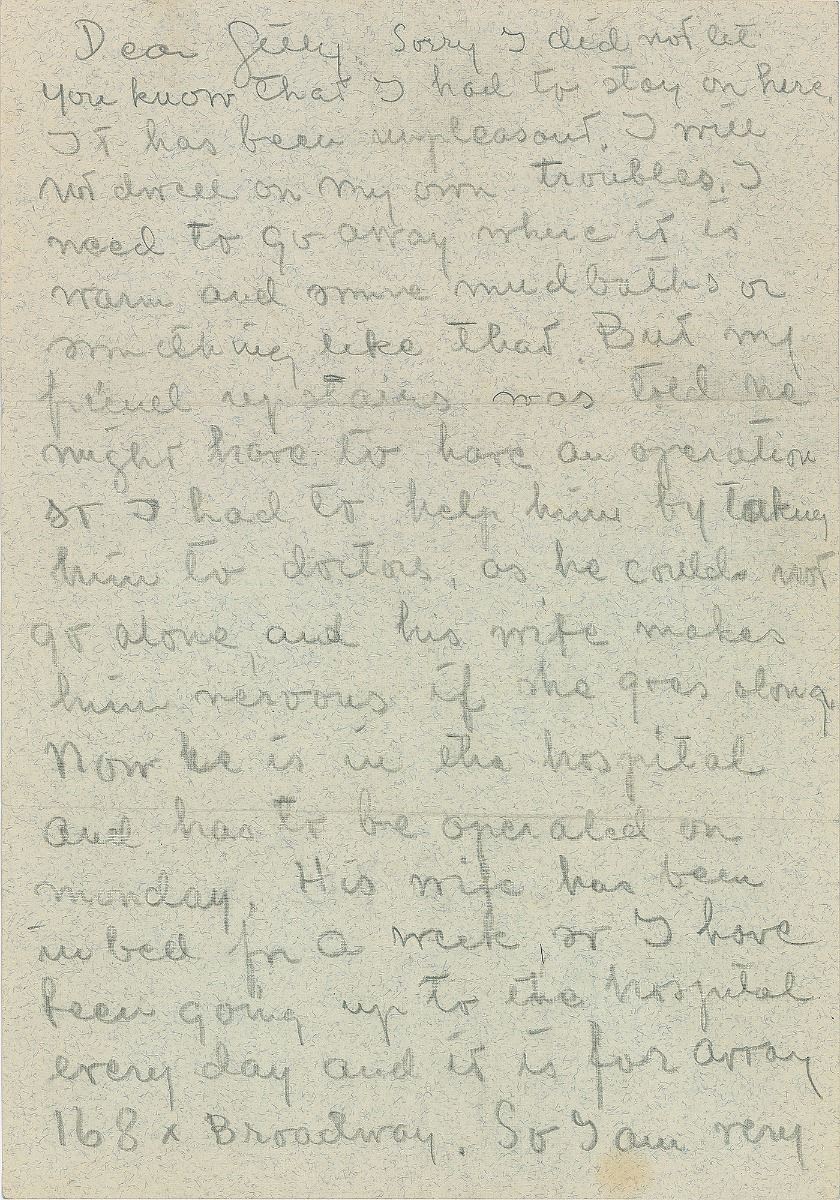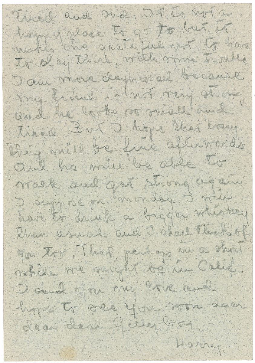 ALS in pencil, signed “Harry,” one page both sides, 7.25 x 10.25, no date but postmarked October 21, 1960. Lengthy letter to “Dear Gilly,” MGM hairdresser Sydney Guilaroff. In part: “Sorry I did not let you know that I had to stay on here. It has been unpleasant. I will not dwell on my own troubles. I need to go away where it is warm and some mud baths or something like that. But my friend upstairs was told he might have to have an operation so I had to help him by taking him to doctors, as he could not go alone, and his wife makes him nervous if she goes along…I have been going up to the hospital every day…So I am very tired and sad. It is not a happy place to go to…I am more depressed because my friend is not very strong, and he looks so small and tired…I suppose on Monday I will have to drink a bigger whiskey than usual and I shall think of you too.” In fine condition. Accompanied by the original mailing envelope addressed in her own hand. The reclusive and eccentric actress often left her letters unsigned or used one of many nicknames or pseudonyms, in this case a shortened version of her frequently used ‘Harriet Brown.’ Garbo letters are uncommon and this example, full of emotional content, reveals her caring and sympathetic nature.