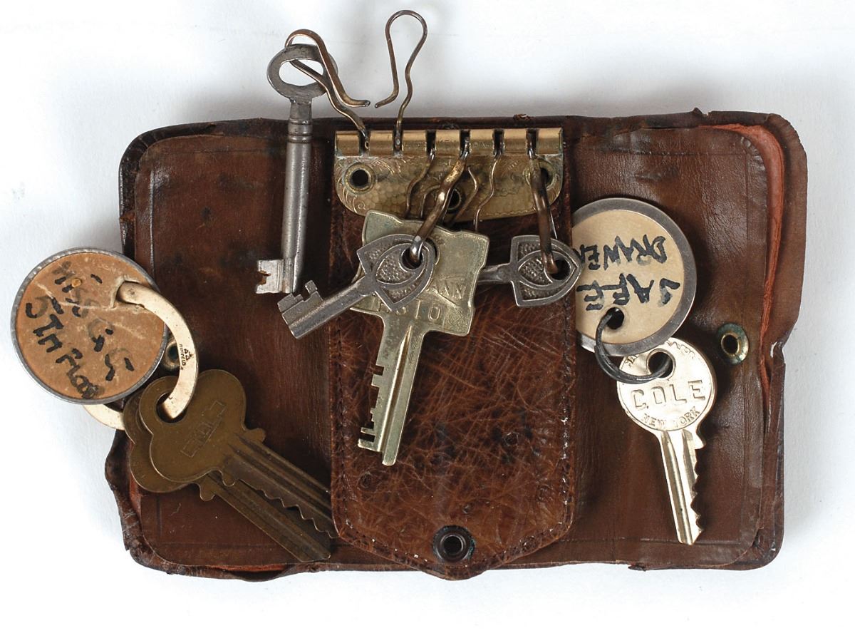 Garbo’s personally-owned and -used keys and leather key wallet, including seven keys and two handwritten tags. Most important is a pair of keys to her Manhattan apartment on a ring with a circular tag labeled by Garbo in ink, “Miss GG, 5th Floor” on one side, and “G. 5 G.” on the other. A smaller key is attached to a similar tag labeled in Garbo’s hand, “Safe Drawers.” The brown ostrich leather wallet measures approximately 2 x 3.75 x .5 and has four keys inside. Expected wear from use and some tears and toning to the handwritten tags, otherwise overall fine condition. Undoubtedly unique memorabilia from this reclusive Hollywood icon. From the estate of Greta Garbo.