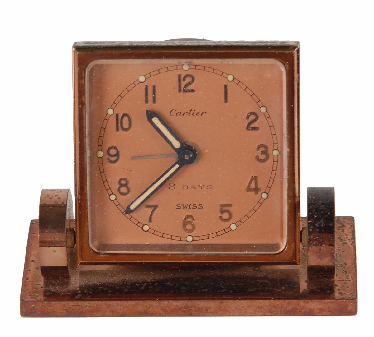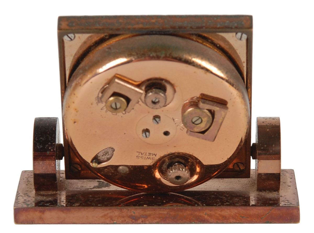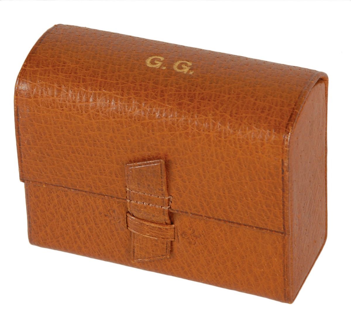 Garbo’s personally-owned and -used Cartier travel alarm clock with its original leather case, 2.75 x 2.25 x 1, gilt-stamped on the cover with her initials, “G. G.” In fine condition, with some mild pitting to the clock’s metal. According to her grandniece, Garbo relied on this alarm clock during numerous trips. From the estate of Greta Garbo.