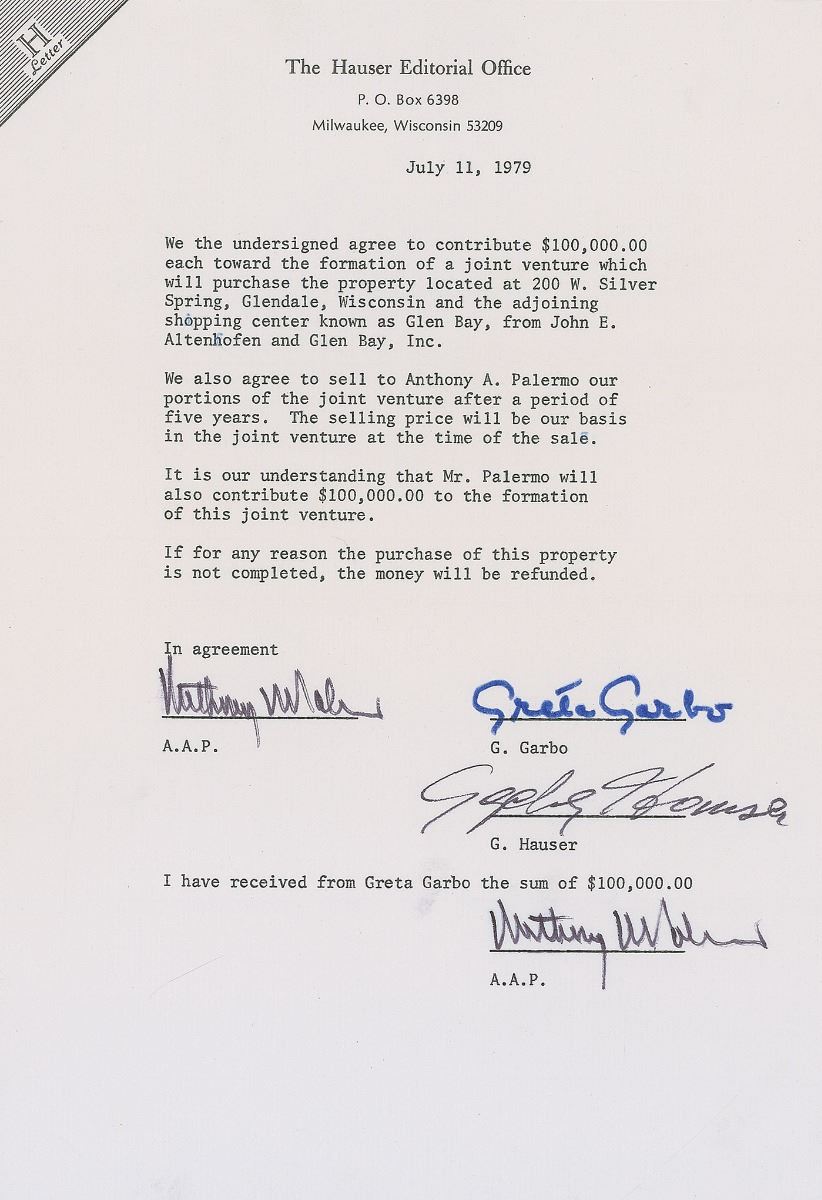 DS, one page, 7.25 x 10.5, July 11, 1979. Agreement between Garbo and the Hauser Editorial Office concerning an investment, in part: “We the undersigned agree to contribute $100,000 each toward the formation of a joint venture.” Signed at the conclusion in felt tip by Greta Garbo and Gayelord Hauser, and countersigned twice by Anthony Palermo to confirm both the agreement and his receipt of the funds. In fine condition, with expected document wear.