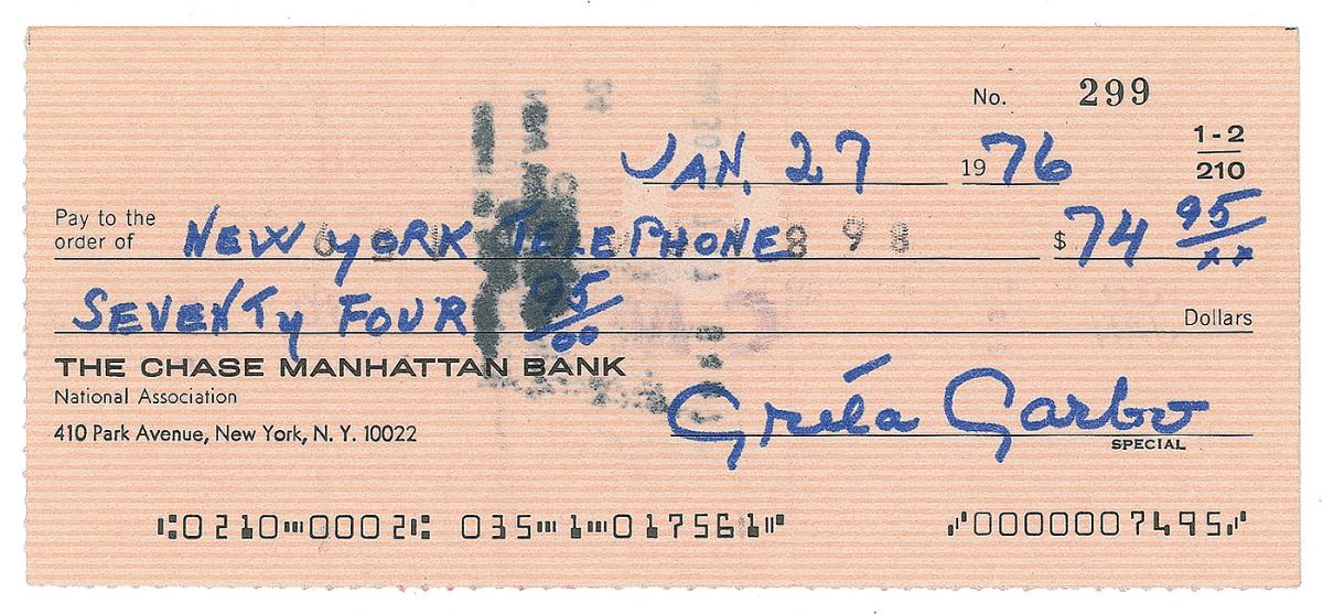 Chase Manhattan Bank check, 6.25 x 2.75, filled out and signed by Garbo, payable to New York Telephones for $74.95, January 27, 1976. In fine condition.