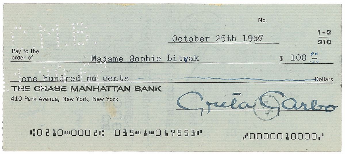 Chase Manhattan Bank check, 6.25 x 2.75, filled out in type and signed by Garbo, payable to Madame Sophie Litvak for $100, October 25, 1967. In fine condition. From the estate of Greta Garbo. Sophie Litvak, a French model, was the wife of Oscar–nominated director Anatole Litvak, who edited Garbo’s early film The Joyless Street.