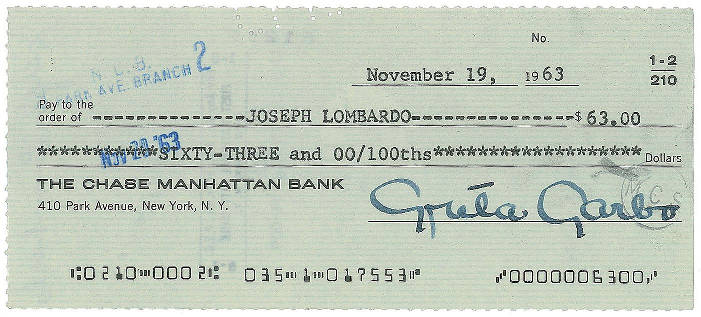 Chase Manhattan Bank check, 6.25 x 2.75, filled out in type and signed boldly by Garbo, payable to Joseph Lombardo for $63, November 19, 1963. In fine condition. From the estate of Greta Garbo.