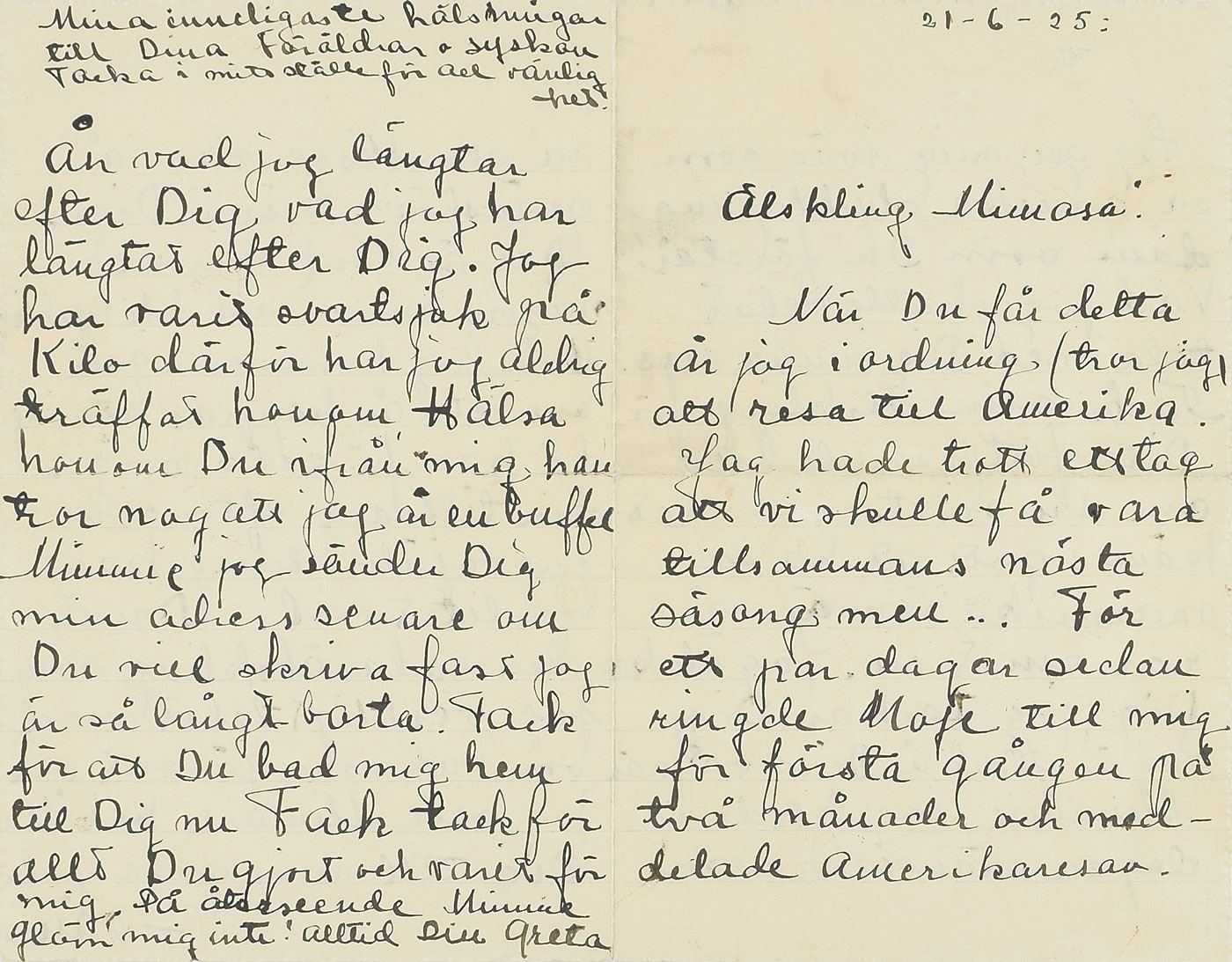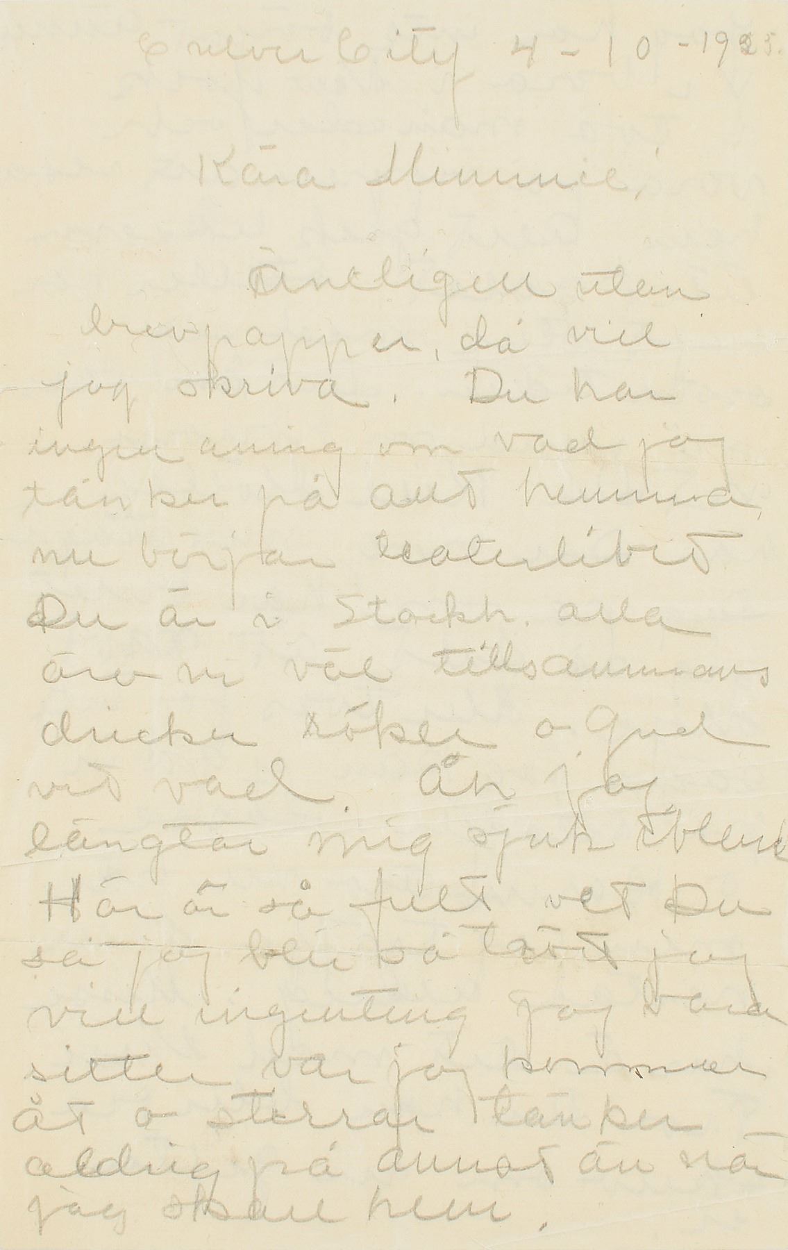 Culver City, October 4, 1925: “I haven’t started yet. We lived in New York for two months and were just at the point of returning home. Everything went sort of haywire. Stiller has been unlucky lately. It has been a pity for him.”
