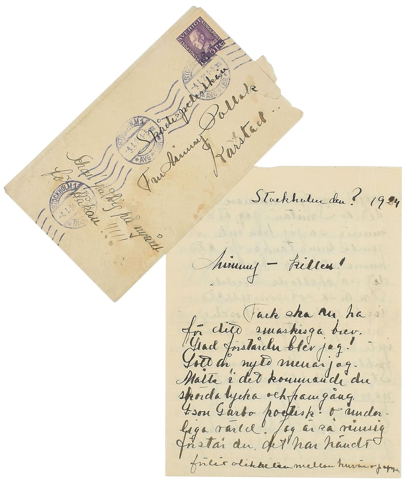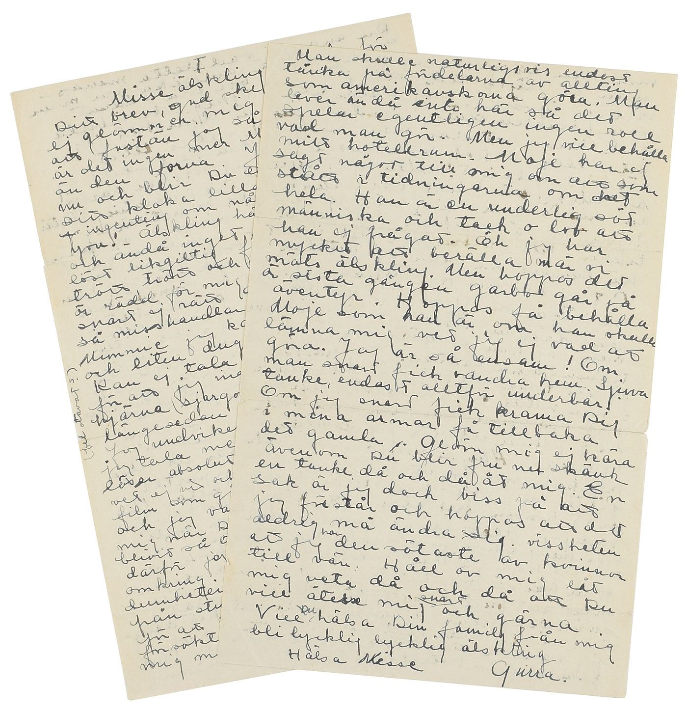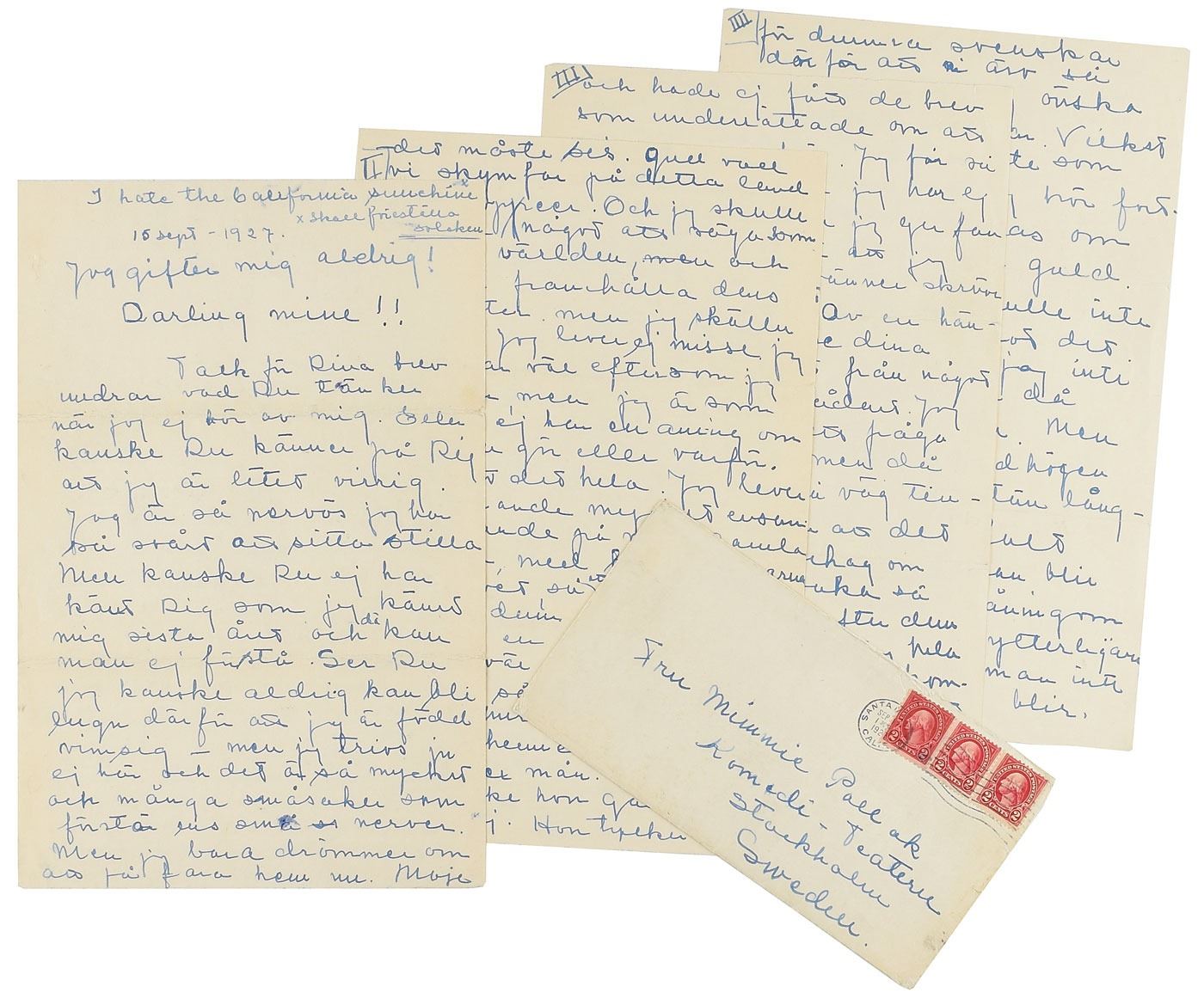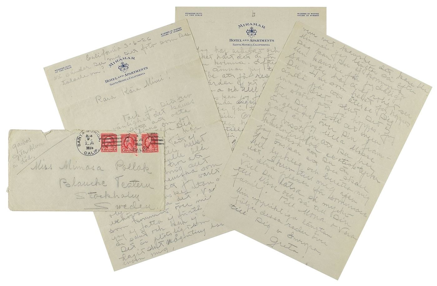 Archive of 21 ALSs in Swedish, plus one TLS in English, mostly signed "Gurra" (with a few signed "Greta" or "G"), from Greta Garbo to fellow actress Mimi Pollak, totaling 85 pages, dated from 1924–1970. Greta Garbo’s letters to fellow actress, Mimi Pollak, are perhaps the only extensive personal record of the future screen legend during the pivotal period of her arrival in Hollywood and the earliest years of her film career. Writing candidly to her closest friend, Garbo covers her stay in New York, the impact of the tragic death of her sister, Alva, the devastating failure of her mentor, Mauritz Stiller (Moje), her difficulties in adjusting to the Hollywood studio system, and the cultural dissonance of America for a European. Deeply conflicted about her personal life and trapped in the Studio System, a lonely Garbo writes from “cheap and vulgar” Hollywood, longing for home. A remarkable archive of her early years in America. In overall very good to fine condition. Accompanied by 16 original mailing envelopes, plus translations for each of the letters.