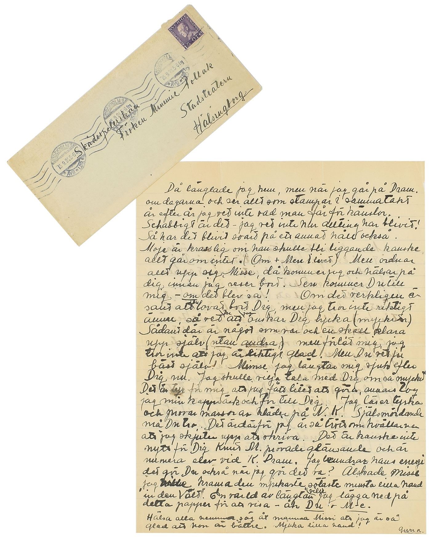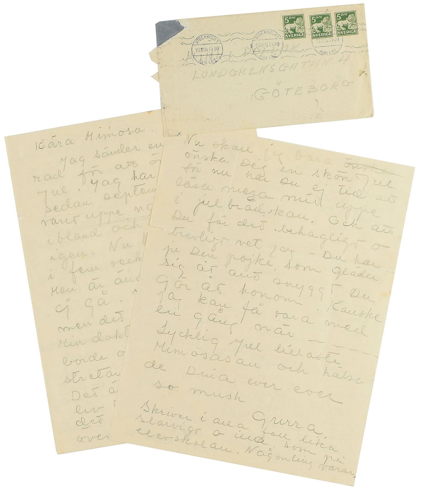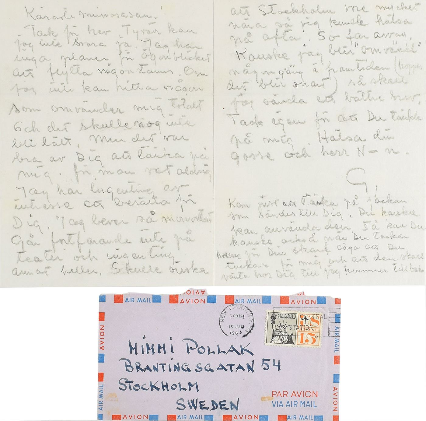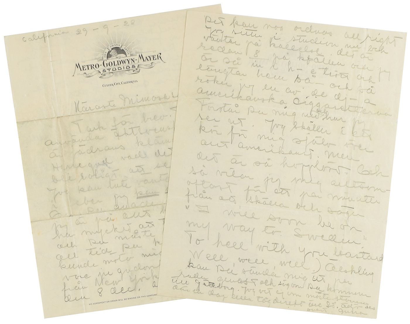 Archive of 21 ALSs in Swedish, plus one TLS in English, mostly signed "Gurra" (with a few signed "Greta" or "G"), from Greta Garbo to fellow actress Mimi Pollak, totaling 85 pages, dated from 1924–1970. Greta Garbo’s letters to fellow actress, Mimi Pollak, are perhaps the only extensive personal record of the future screen legend during the pivotal period of her arrival in Hollywood and the earliest years of her film career. Writing candidly to her closest friend, Garbo covers her stay in New York, the impact of the tragic death of her sister, Alva, the devastating failure of her mentor, Mauritz Stiller (Moje), her difficulties in adjusting to the Hollywood studio system, and the cultural dissonance of America for a European. Deeply conflicted about her personal life and trapped in the Studio System, a lonely Garbo writes from “cheap and vulgar” Hollywood, longing for home. A remarkable archive of her early years in America. In overall very good to fine condition. Accompanied by 16 original mailing envelopes, plus translations for each of the letters.
