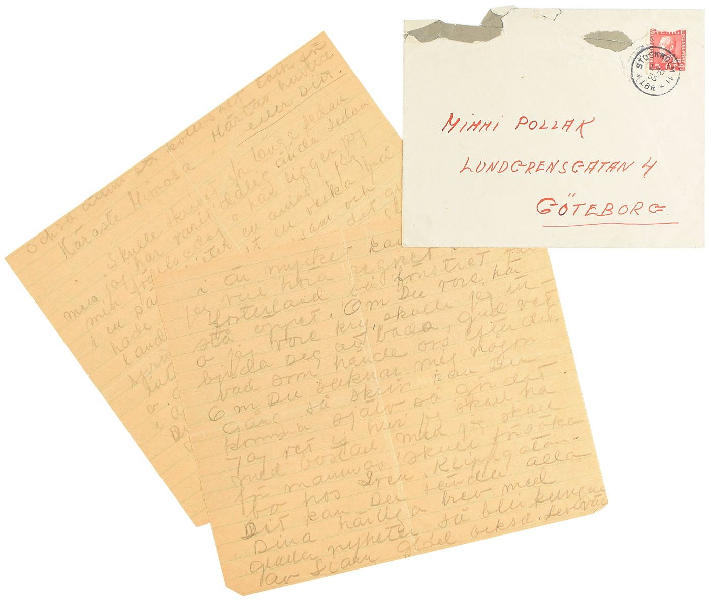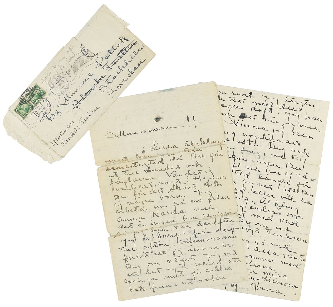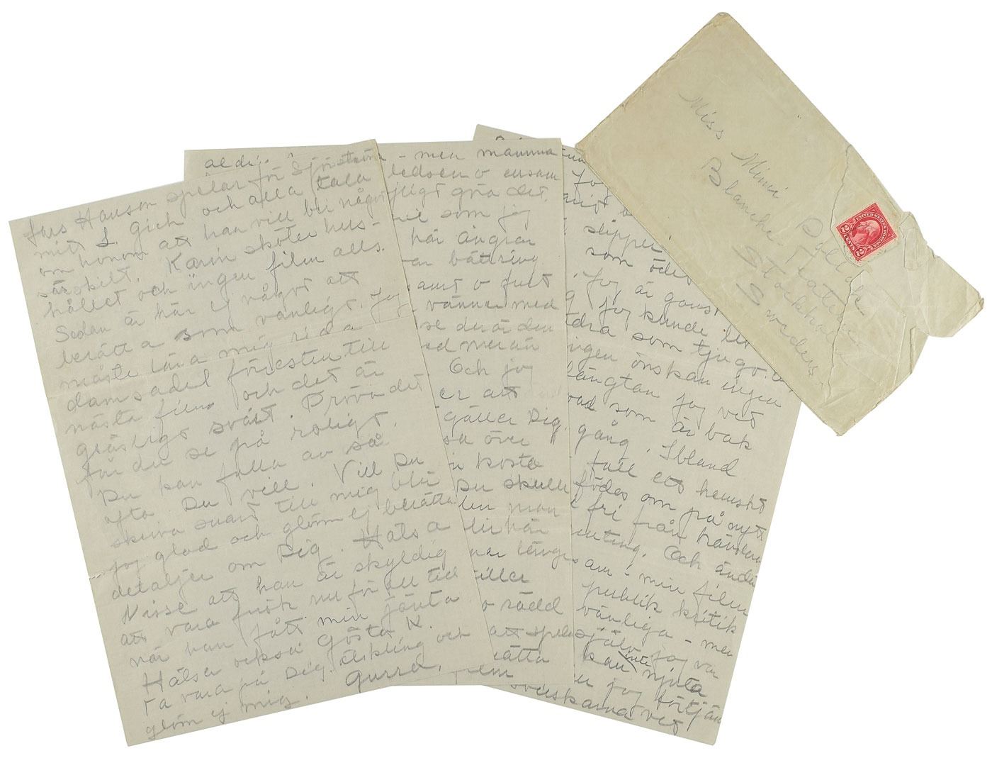 Garbo attended the Royal Dramatic Theatre [Dramaten] school in Stockholm with Pollak from 1922 to 1924, where she developed a deep infatuation with Pollak. It is unclear whether this was an unrequited love, but Garbo’s letters offer extraordinary insight into her private personal life and unveil a dimension of her enigmatic sexuality. Even when Pollak was happily married to actor Nils Lundell and pregnant with their child, Garbo wrote to her saying she believed they were meant to be together. Garbo and Pollak maintained a famous sixty-year correspondence, portions of which were published only recently. As an amazing collection of early and incredibly personal letters to the object of her affections, these letters are of the utmost rarity and desirability.