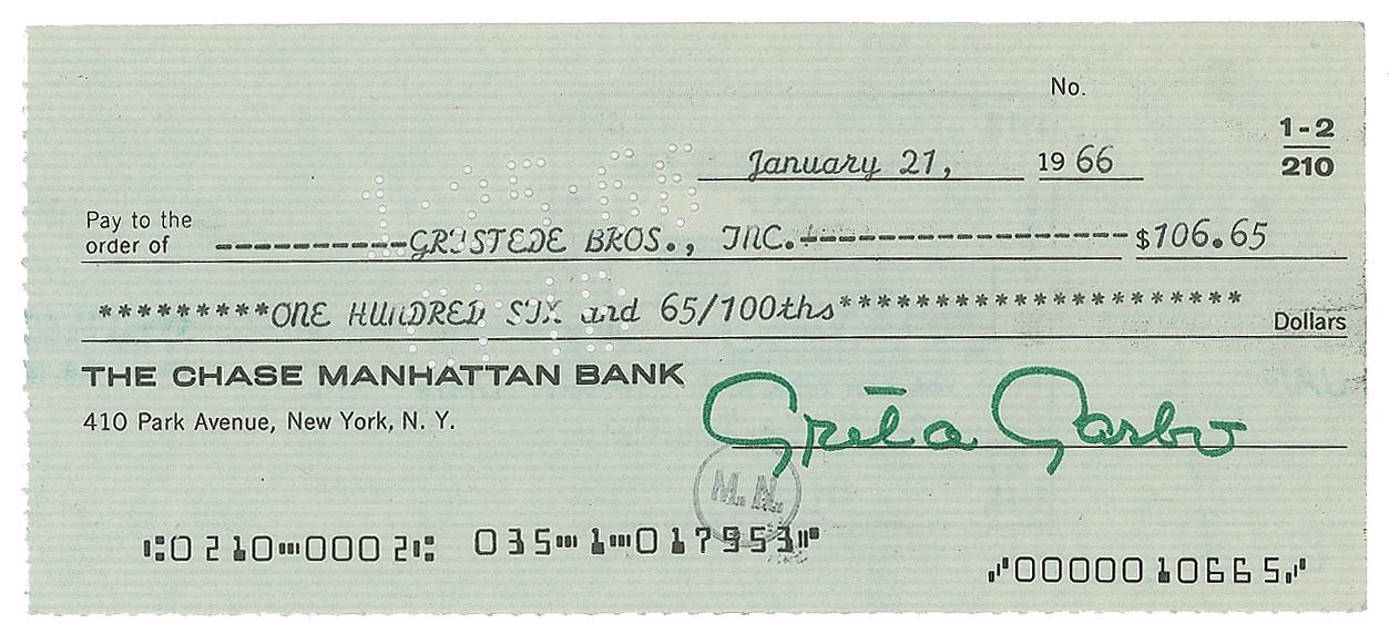 Personal check, 6.25 x 2.75, filled out in type and boldly signed by Garbo, "Greta Garbo," payable to Gristede Bros., Inc. for $106.65, January 21, 1966. In fine condition.