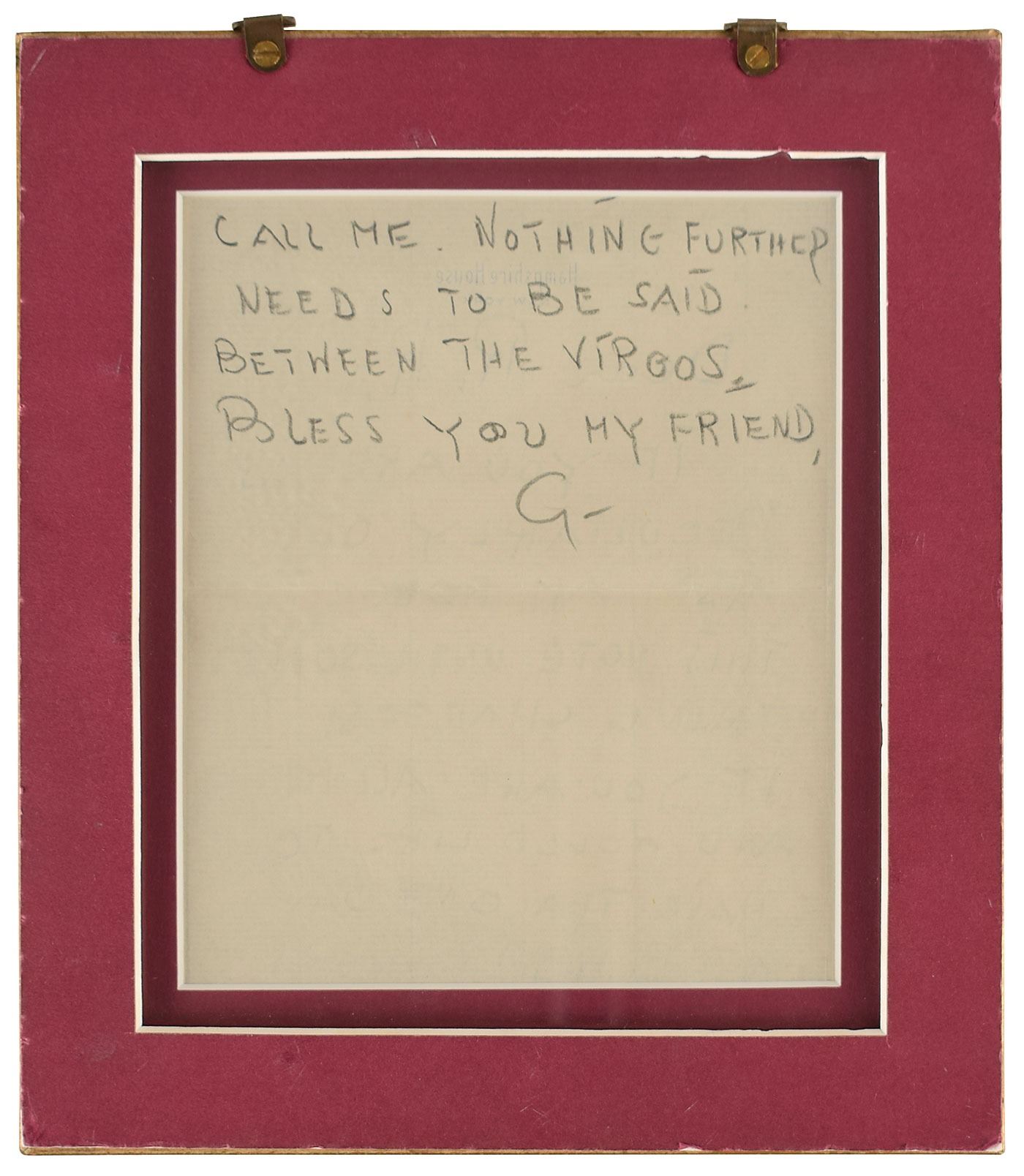 ALS in pencil signed “G,” one page both sides, 5.25 x 6.5, Hampshire House letterhead, no date. Letter to "R. R.," her friend and confidant Robert Reud, in full: "If you are as peculiarly off as I am forget this note until something changes. If you are all right and would like to have tea one day at Rumpelmayer's call me. Nothing further needs to be said between the Virgos. Bless you my friend." Matted and framed to an overall size of 8 x 9, with a window in the backing for viewing the reverse; the frame can be hung upon a larger framed display, which features two portraits of the adored actress, and measures to an overall size of 36.25 x 18.5. In fine condition.