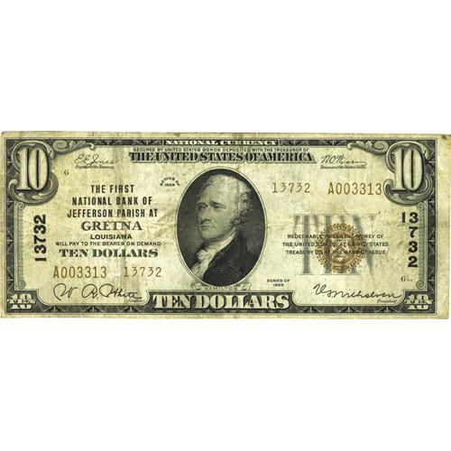 <B>Gretna, LA</B></I> - $10 1929 Ty. 2 <B>The First NB of Jefferson Parish</B></I> Ch. # 13732<BR>A scarce bank, from this one bank town, that is represented by just nine notes, all small size, and a couple of uncut sheets. The body of this note is <B>Very Fine</B></I> with a bit of light soiling.