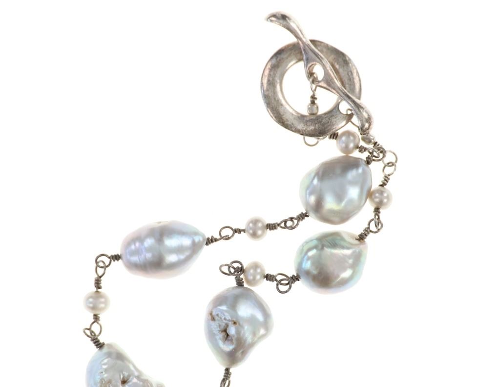 Featured in this lot is this grey baroque pearl sterling silver sea shell necklace. The necklace features a wonderfully and professionally crafted sterling silver and grey baroque pearl construction that shows a total of 12 natural baroque pearls with 14 smaller grey fresh water pearls spaced between them. The central pendant is the only carved pearl in the shape of a sea shell. The pendant and the clasp is marked as follows: .925. The condition of this pearl necklace is good with no obvious signs of damage and shows a good overall condition. The measurements of this necklace from clasp to clasp is 20 3/4" and the central pendant measures 2" x 7/8". The collective weight of this necklace is 58.4g. Provenance: From a prominent ex-Bozeman private collection who purchased the majority of his collection from Cowan's, Skinner, Bonhams, Morphy's, Sotheby's, March in Montana, North American Auction and other well revered auction houses.