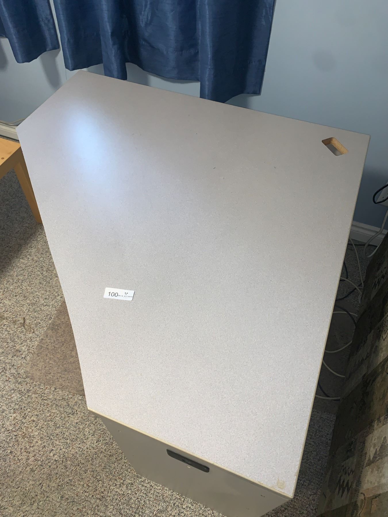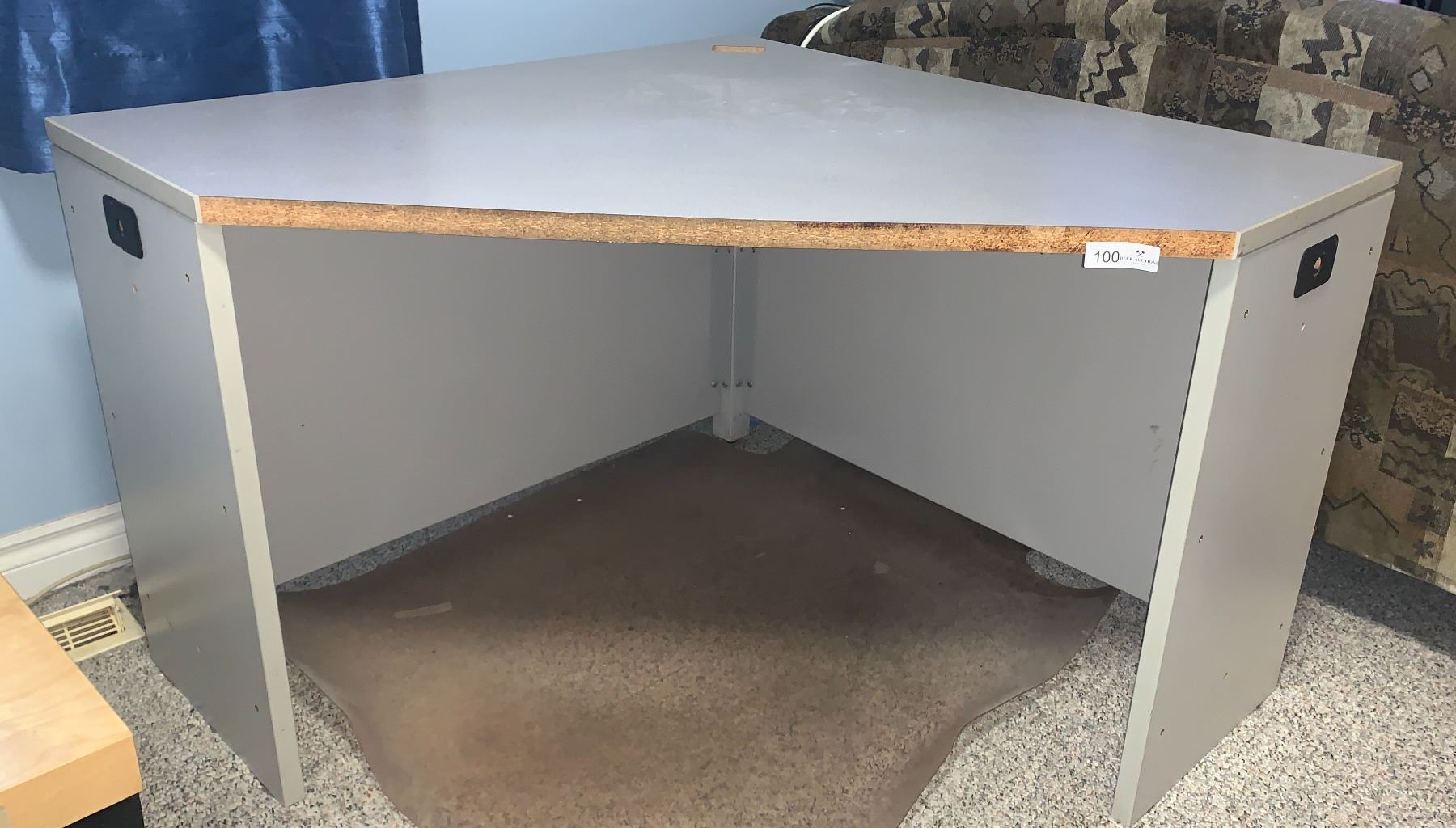 Grey Corner Desk, 43" x 43" x 29" (60" corner to corner), and Ikea Side Table