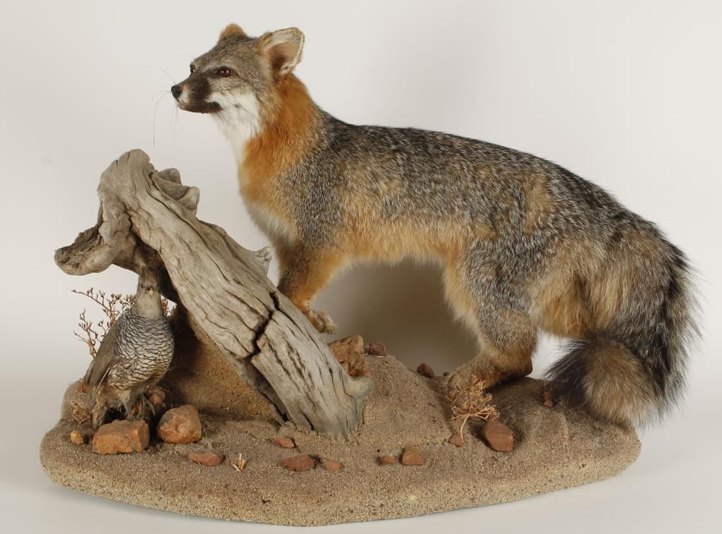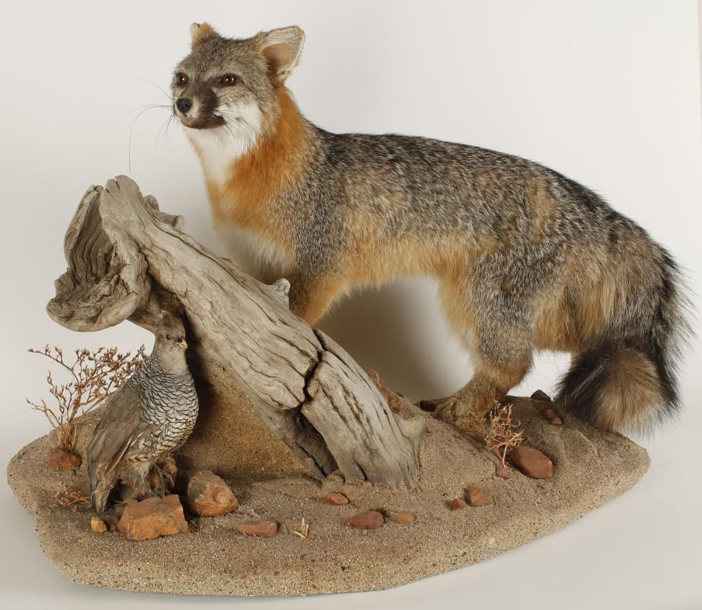 Full body fox mounted and measures approx. 32" by 19" by 20" tall. Fox is beside a dried tree stump which conceals a small scaled quail.