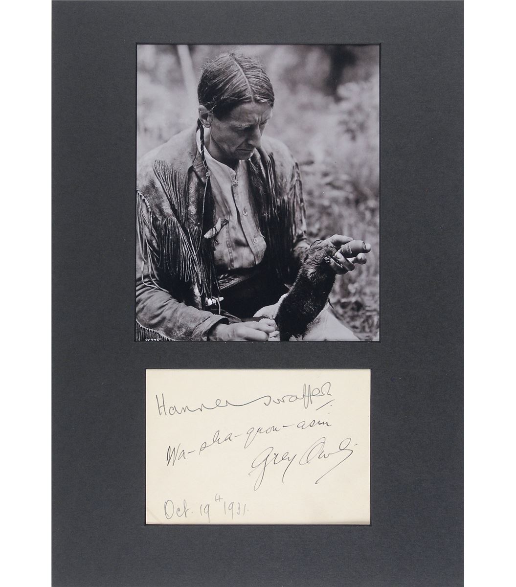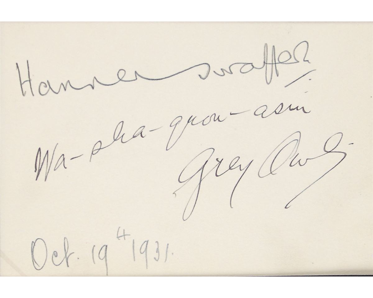Notable British author, lecturer, and conservationist (1888–1938) born Archibald Belaney. Fountain pen signature, “Wa-sha-quon-asin, Grey Owl,” on a 4.5 x 3 off-white slip, dated in another hand October 19, 1931. Slip is also signed by British journalist Hannen Swaffer. Matted with a portrait of Grey Owl feeding a beaver kit to an overall size of 8.25 x 11.75. In fine condition.