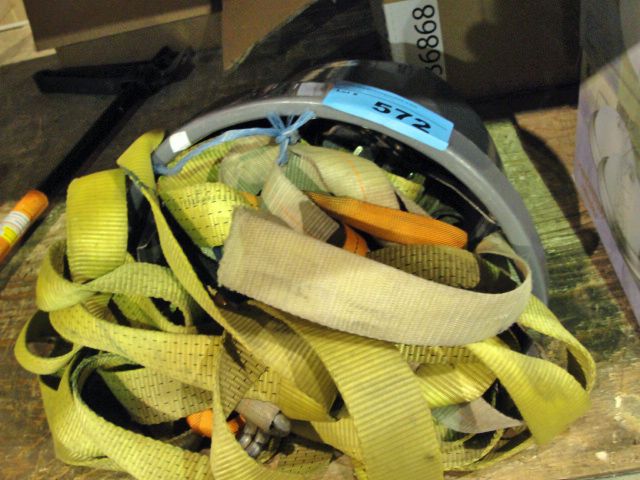 Grey pail filled with assorted tie down straps