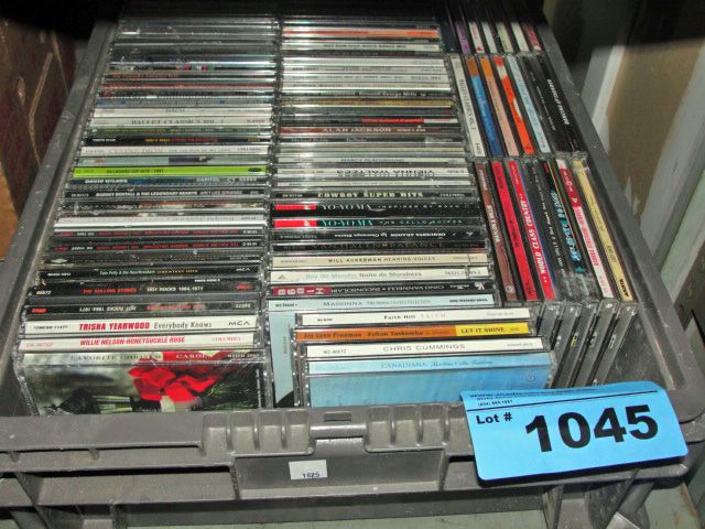 Grey storage bin full of music CDs