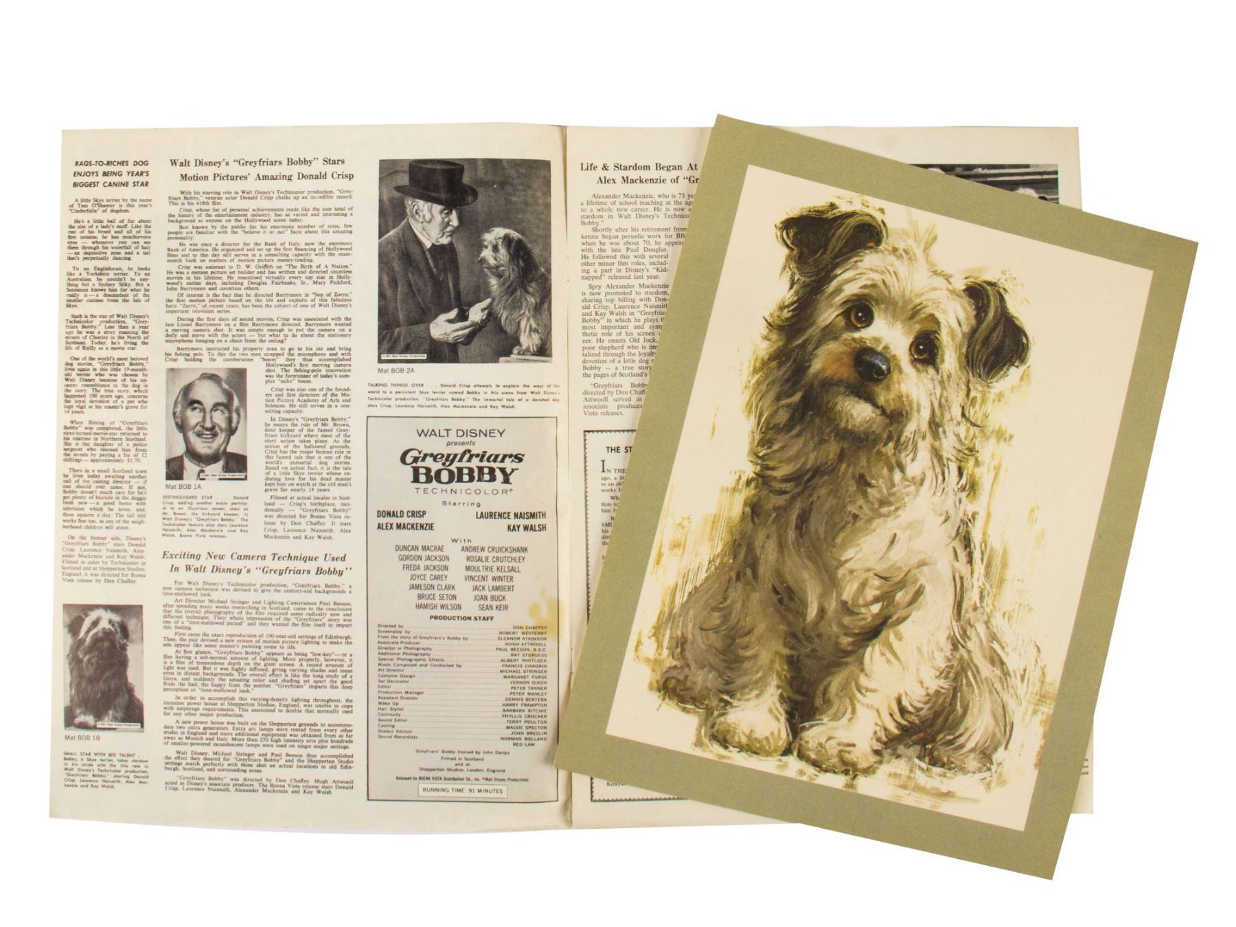 (Walt Disney Studios, 1961) A promotional campaign booklet for the release of "Greyfriars Bobby". This booklet includes information regarding press releases, advertising strategies, and other promotional materials. The booklet also contains a separate promotional print of Bobby. Booklet measures 14.75"x11" and the print measures 14"x11". The condition of the booklet is good to very good with some wear, including a crease from being folded in half and expected edge-wear from use. The condition of the print is very good with minimal edge-wear.