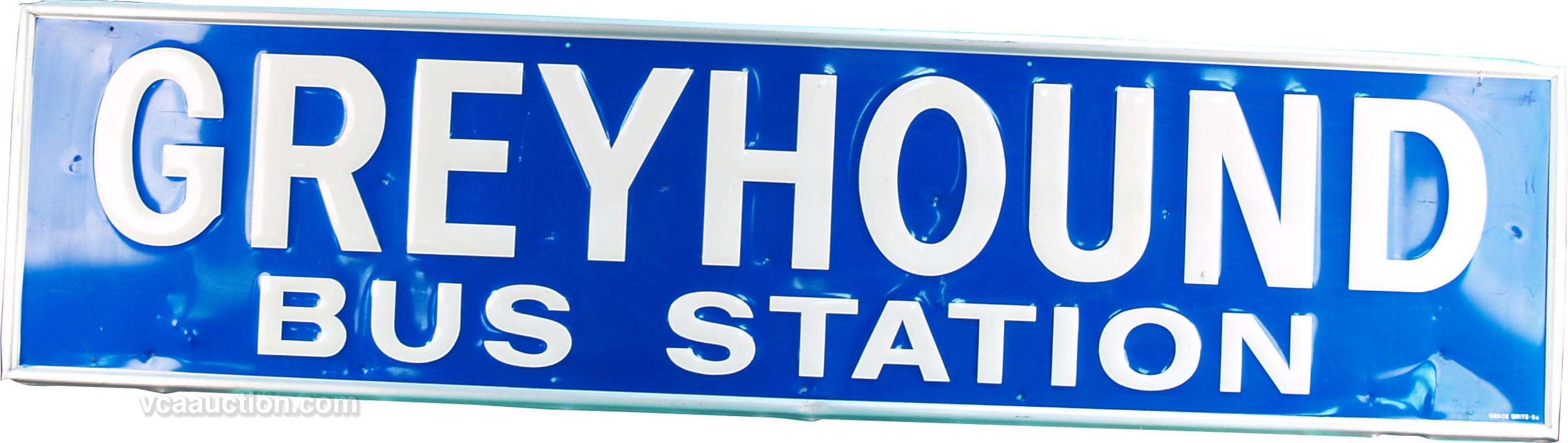 Greyhound Bus Station Embossed Tin Sign, Blue w/ White Letters, By Shiny-Brite 1951, Excellent Condition - 72" x 18"
