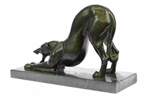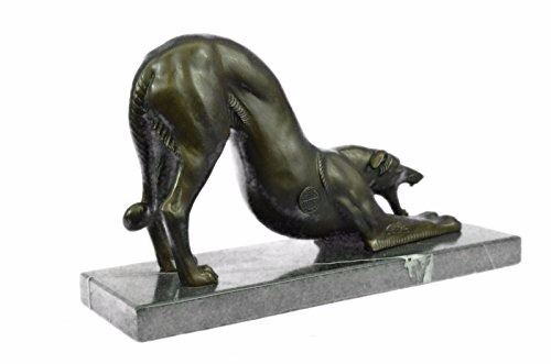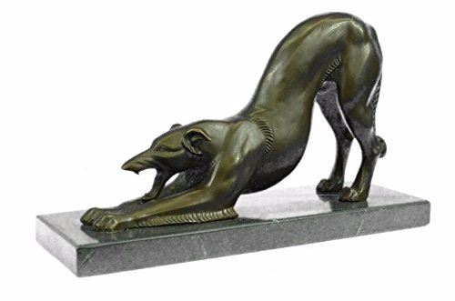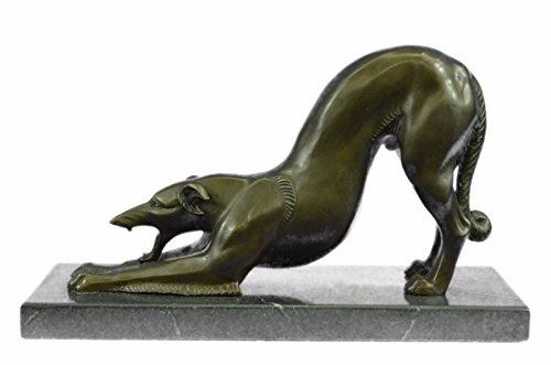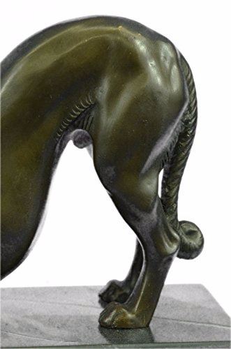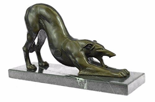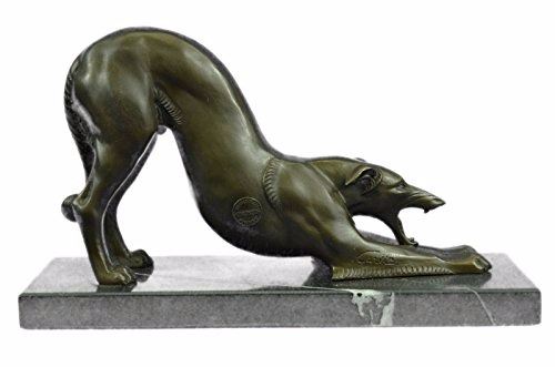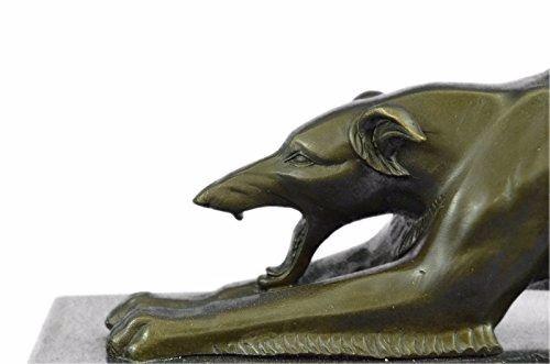 Hunched In Down This Cute Greyhound Reveals A Low Feral Growl. His Mouth Gapes Open Bearing His Sharp Teeth To His Prey, Instilling Anticipation And Fear. The DogS Flexible Lean Body Is Beneficial In His Hunt. His Hind Is Pressed To The Sky. He Is Ready To Pounce. This Sculpture Was Crafted Using The Lost Wax Method and It Rests On A Black Marble Base. Bronze dimensions with marble base: Height 7 X Width 10 inches. Weight: 7 lbs.
