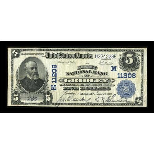 <B>Gridley, IL</B></I> - $5 1902 Plain Back Fr. 606 <B>The First NB</B></I> Ch. # (M)11208<BR> An extremely rare McLean County bank which was in business for only five years before departing in 1923. The Kelly census shows just five notes extant from the bank, the sole issuer here, with this the only $5. <B>Very Fine</B></I>. <I>Ex-Lynn Shaw Collection.</B></I><BR><BR><b>Shipping:</b> Coins & Currency (<a target="_blank" href="http://www.heritageauctions.com/common/shipping.php">view shipping information</a>)