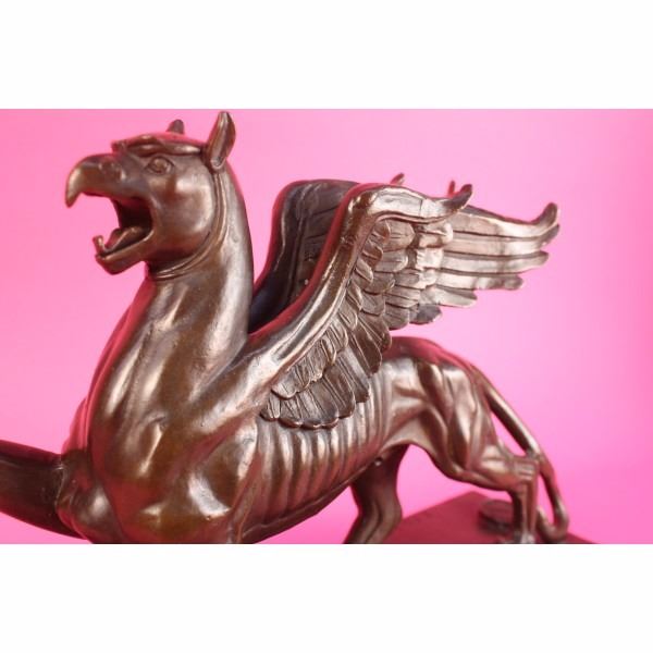 The griffin is a legendary creature with the body of a lion and the head and wings of an eagle. As the lion was traditionally considered the king of the beasts and the eagle was the king of the birds, the griffin was thought to be an especially powerful and majestic creature. The griffin was also thought of as king of the creatures. Griffins are known for guarding treasure and priceless possessions. In antiquity it was a symbol of divine power and a guardian of the divine. The bronze sculpture has a lion's, body, tail, forelimbs and hindquarters with the majestic wings of the eagle. The handmade bronze sculpture was cast using the archaic method of lost-wax casting and stained with a brown patina finish for perpetuation. It is mounted upon a black marble base with the European Bronze Finery stamp of quality and the artist P. Roche's signature. Condition: This sculpture is in perfect condition. Bronze Dimensions with Marble Base:Height 9" x Width 13" Marble Dimensions:12" x 4" Height without base: 8" Weight :15 LBS Inventory : 71X07423817