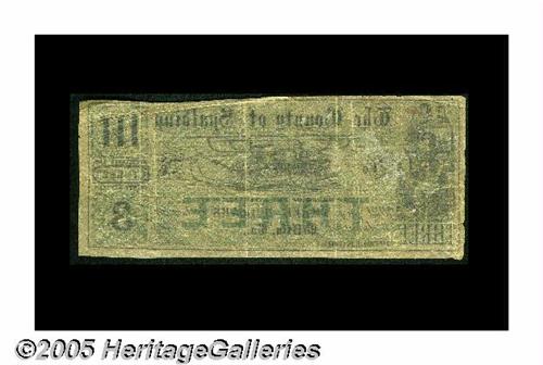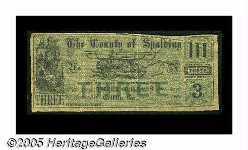 <B>Griffin, GA- County of Spaulding</B></I> $3 1863<BR>A very rare Georgia county issue with this full size three the first from here we've had to offer. It's fully green tinted and printed on tissue thin paper. <B>Very Fine,</B></I> with a couple of minor splits.