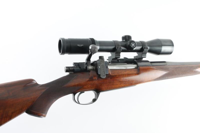 SN: 93713 Bolt action rifle using a Single Square Bridge Magnum length action. Features blued finish, highly figured walnut stock, 26.5" barrel, ramped band front sight base with blade insert & large partially knurled hood, Lyman receiver sight base (no rear sight, base only), bolt knob checkered on face & underneath, side-swing two position safety on bolt shroud, hinged floorplate, drop box magazine, solid rubber buttplate, sling stud at butt, forward sling stud on mid-barrel band, American classic style stock with ebony tip, no cheek piece, checkered panel on forend wraps across bottom, checkered panel at wrist wraps across top, steel grip cap, two inset monogram ovals (blank) on bottom of butt. Crisp single stage trigger. Classic Griffin & Howe type double lever detachable side mount (marked "Wells and Wells" on top). Bottom metal is engraved with edge patterns and floral scrolls. Bore is very good condition. Bolt body is polished, in the white. Rifle retains 95% blued finish, with minor edge wear. Appears reblued, with some small pitted areas under refinish. The underside of the barrel is marked "713", "4 78" & "F". Top of receiver ring and bridge are stippled. Monogram disks show discoloration. Wood is very good condition with handling marks and signs of use in the hand rubbed oil finish. Mounts a very good condition Kahles "Hella S" 1.5-6x42mm scope. LOP 13" (12-1/8" to end of wood). Condition is NRA Excellent *** C& R Firearm ***