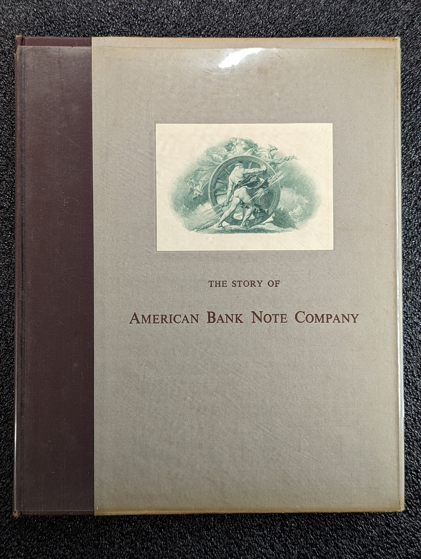Griffiths, William H. THE STORY OF AMERICAN BANK NOTE COMPANY. American Bank Note Company, New York. 1959. 4to. 92, (4) pages. Original gray and maroon cloth, gilt, intaglioprinted cover label. Map. b&w historic photos throughout. 8 double-page plates via letterpress, intaglio steel plate, gravure and offset techniques, some illustrations in color. black ink staining along trailing page edges. protective clear plastic book jacket. English text. Near Fine. This book presents a history of the American Bank Note Company featuring 16 pages of superb vignettes, along with valuable historical information. Lot weight: 1 lbs 12oz. Subject(s): Spanish American Paper Money.