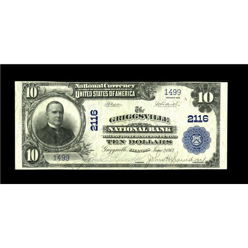 <B>Griggsville, IL</B></I> - $10 1902 Plain Back Fr. 630 <B>The Griggsville NB</B></I> Ch. # 2116<BR>Nine large size notes are known off this institution that expired in 1932. Pleasing surfaces combined with bright inks and embossing deliver a pleasing note. <B>Very Fine-Extremely Fine.</B></I><BR><BR><b>Shipping:</b> Coin/Currency (<a target="_blank" href="http://www.heritageauctions.com/common/shipping.php">view shipping information</a>)