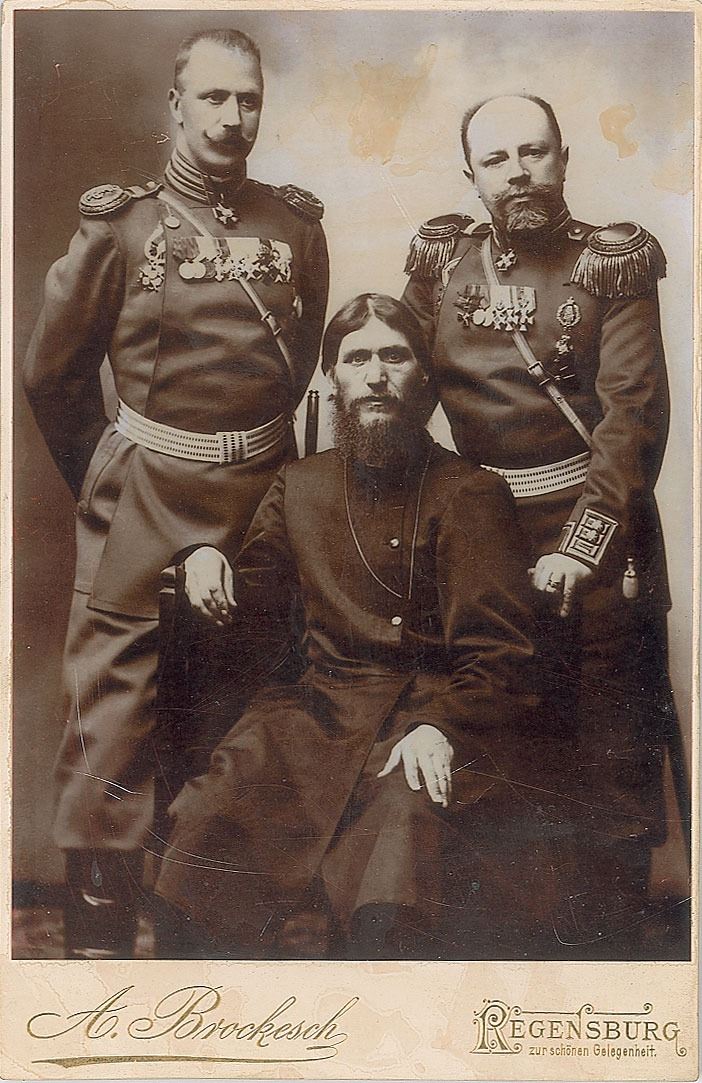 Unsigned original 4.25 x 6.5 cabinet portrait of Rasputin seated between Count Mikhail Sergeyevich Putyatin and Colonel Dmitry Nikolaevich Loman in 1904. Published by A. Brockesch of Regensburg. In fine condition, with some light stains to the background.