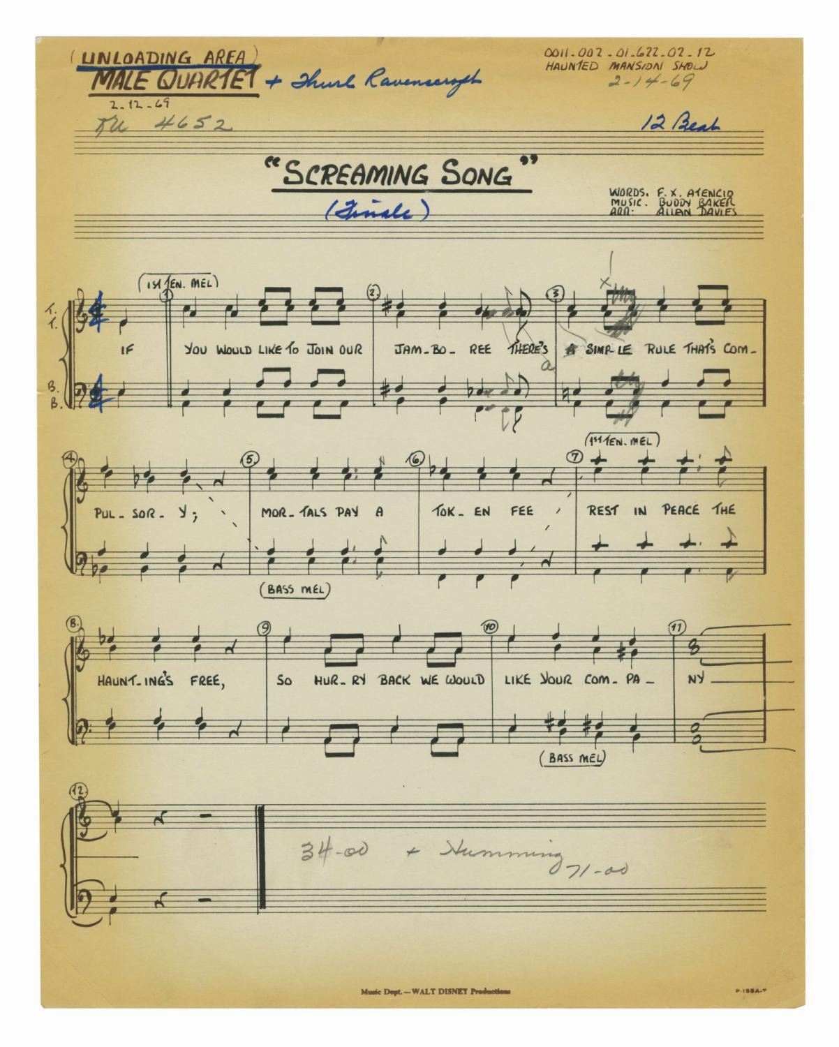 (Disneyland, 1969) An original vocal arrangement used by legendary voice actor Thurl Ravenscroft during recording of the Haunted Mansion's theme song, Grim Grinning Ghosts (The Screaming Song). Written by Buddy Baker and X. Atencio and arranged by Allan Davies, the photostatic musical arrangement is hand annotated in pencil, pen, and ink, throughout. Ravencroft's name has been added to the top and the piece is dated 2-14-69. There are changes to the time signature, musical notes added and subtracted, and the line "There's A Simple" is handwritten over a correction fluid redaction. This incredible document provides an important look behind the scenes of the creation of one of the most iconic songs in Disney history, which figuratively and literally sets the tone for one of the most popular theme park attractions in the world. Measuring 14"x11", the sheet music arrangement is in very good condition with yellowing, edge darkening, corner creasing, a faint vertical crease running the length of the page, and handling wear.