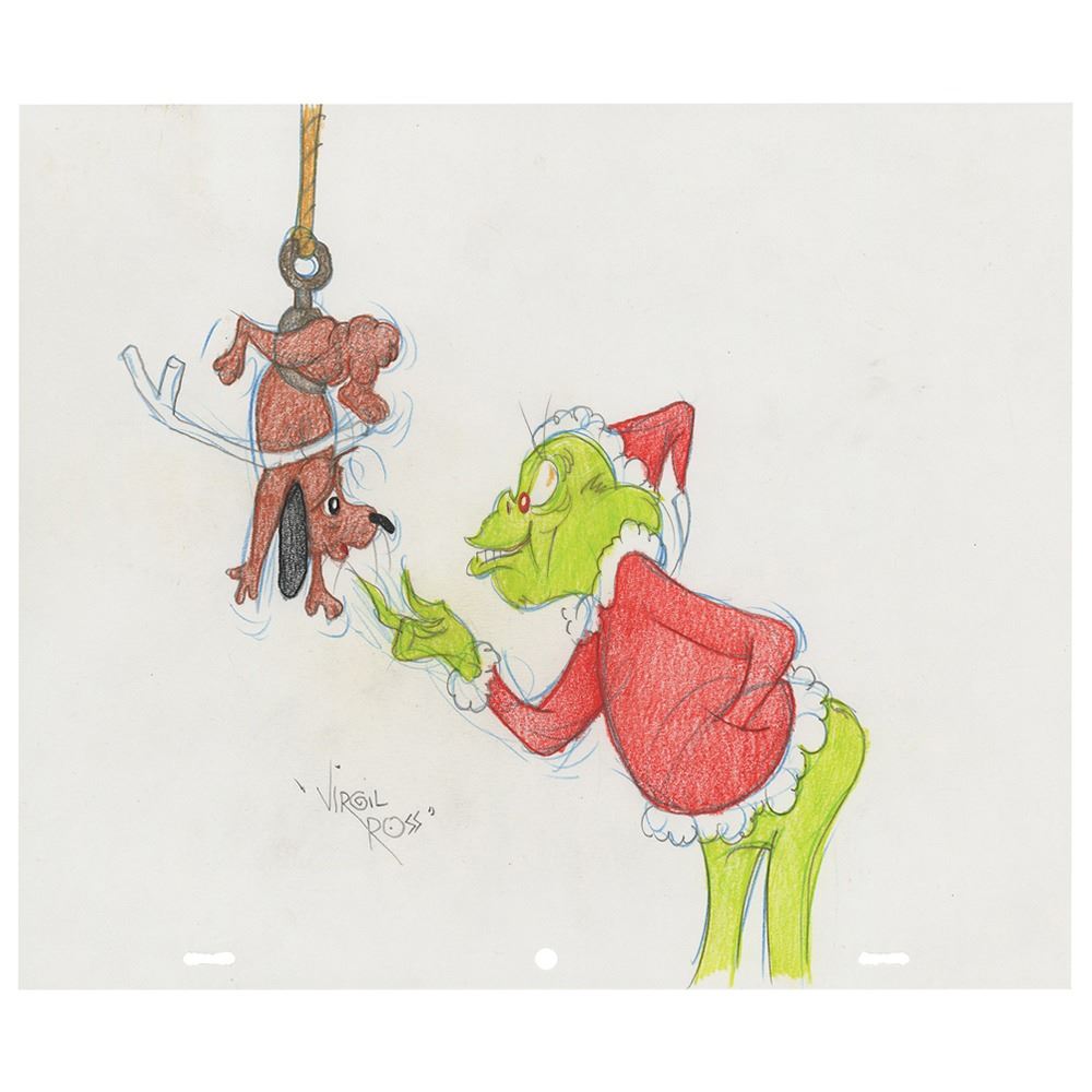 (Warner Brothers Studios, 1990s) Original drawing by Virgil Ross featuring the Grinch dressed as Santa Claus, with his little dog Max—wearing reindeer antlers—hanging in front of him. Accomplished in graphite and colored pencil on untrimmed 12.5 x 10.5 animation paper, signed at the bottom in pencil, "Virgil Ross." In fine condition. This one-of-a-kind drawing was done to be sold in the Warner Brothers Studio stores in the 1990s.