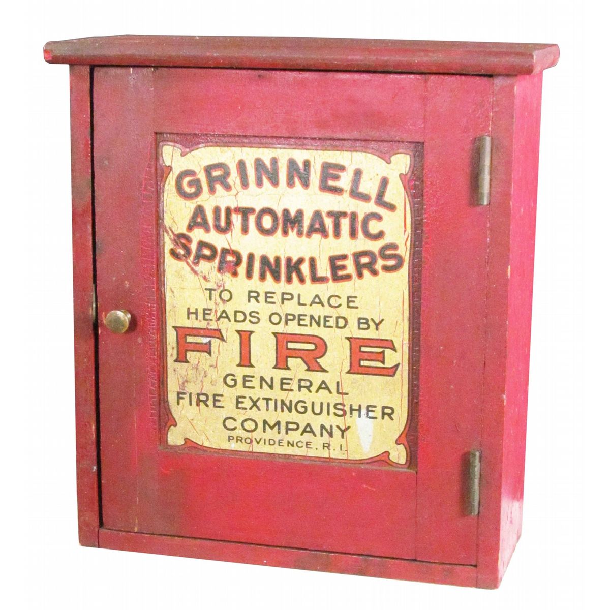 Grinnell Automatic Sprinklers Wooden Storage Box. General Fire Extinguisher Co. Providence, RI. Complete with paper instruction label and set of 12 original sprinkler heads. 9 1/2 X 10 1/2 X 3 1/2 inches.
