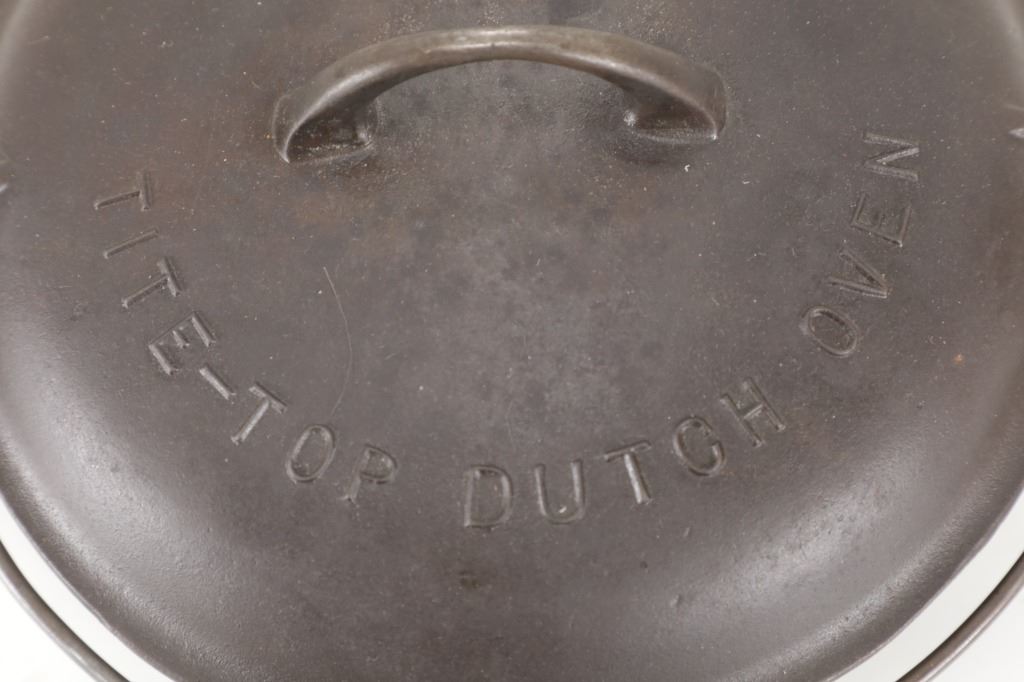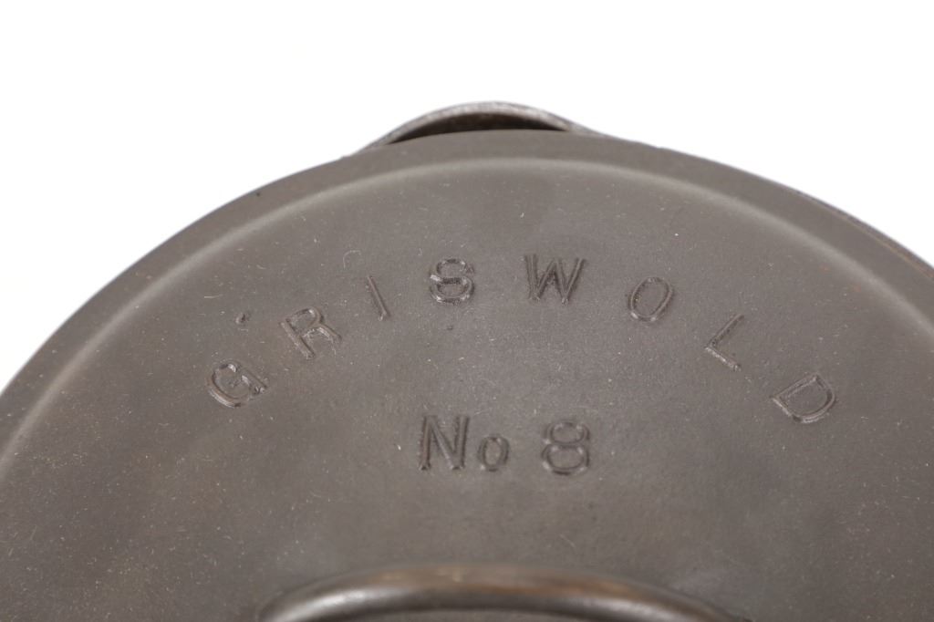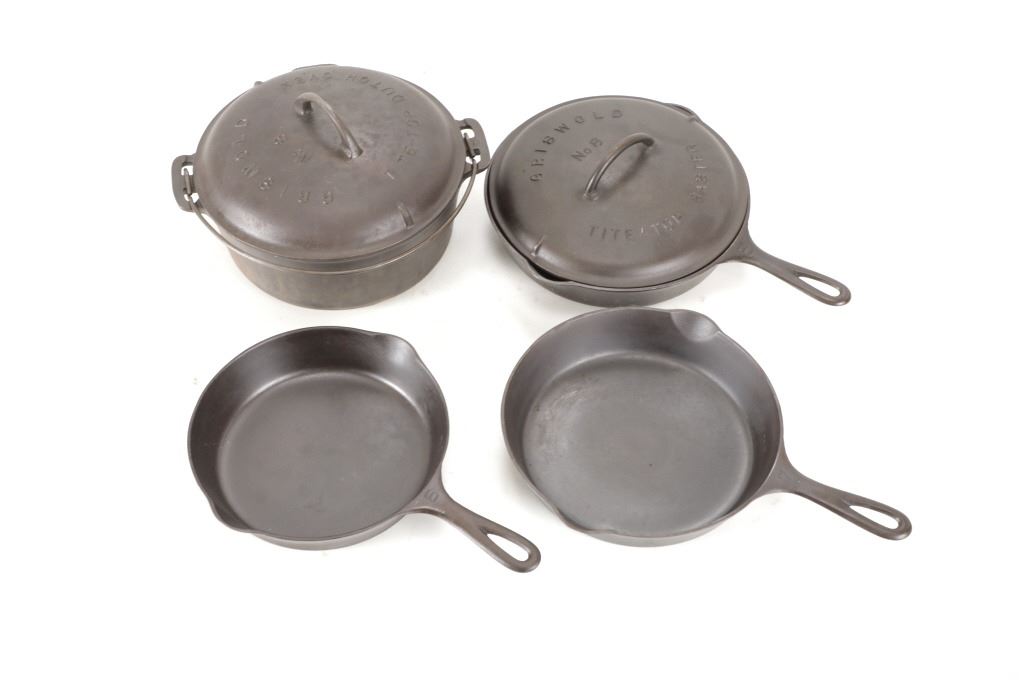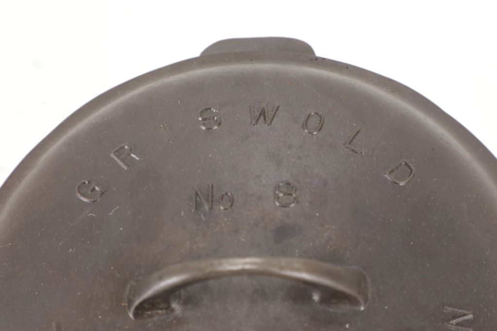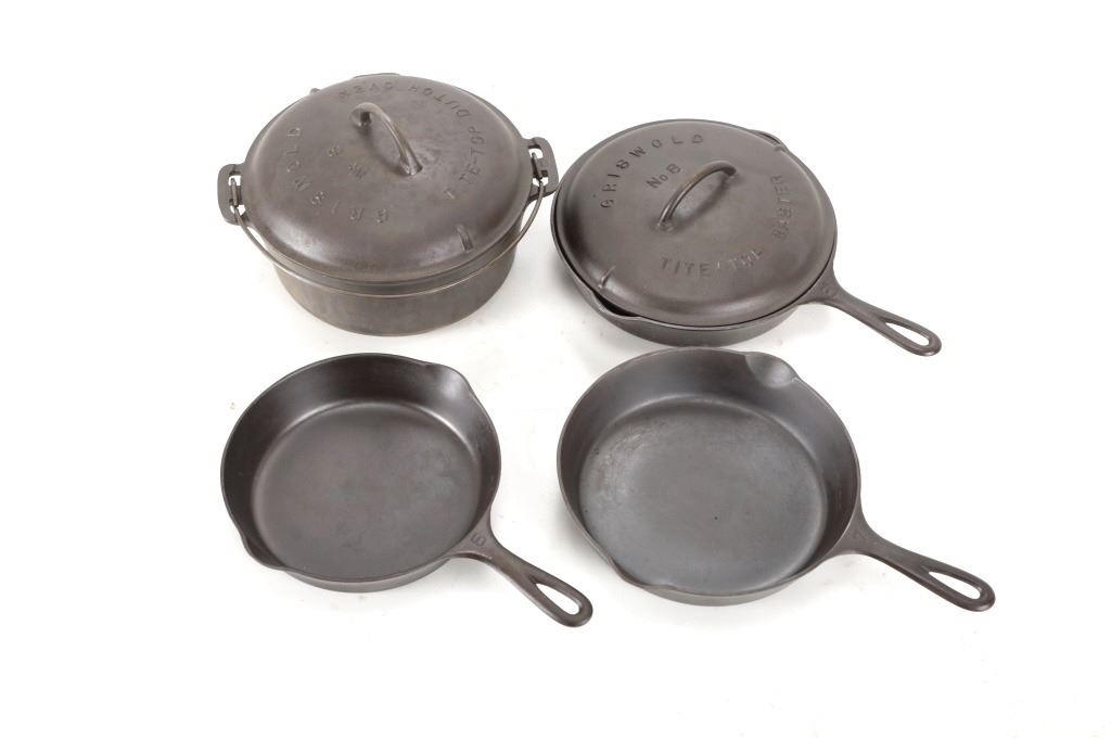For your consideration is this Griswold cast iron skillet and Dutch oven set from 1920. Griswold Manufacturing, founded in Erie, Pennsylvania in 1865, was a prominent American manufacturer of cast-iron kitchen products, known for its high-quality cookware. The company's journey began with the production of butt hinges and then expanded to include a wide range of cast-iron products like skillets, griddles, and kettles. While initially a small foundry, Griswold evolved into a leading brand, even branching into aluminum and electric cookware later in its history. This set includes three skillets, numbers 6,7 and 8 and a large cast iron pot with a tite-top dutch oven lid and a tite-top baster lid. They are marked on the bottom reading, "Griswold / Eyrie, PA., U.S.A.". They show good condition overall with little to no wear present and no signs of damage is noted. The skillets measure from 13 3/4" L x 9 5/8" W x 1 7/8" H to 15 3/8" L x 11 1/4" W x 2" H, while the dutch oven measures 10 5/8" L x 12 1/4" W x 4" H. The set has a collective weight of 22 pounds and 4 ounces.