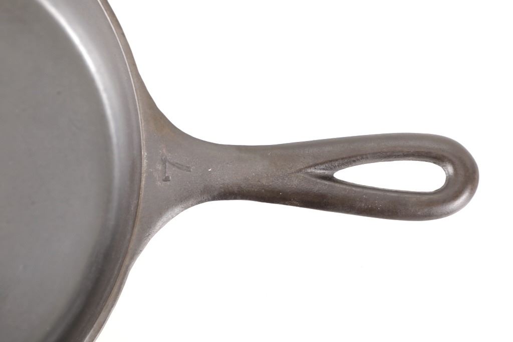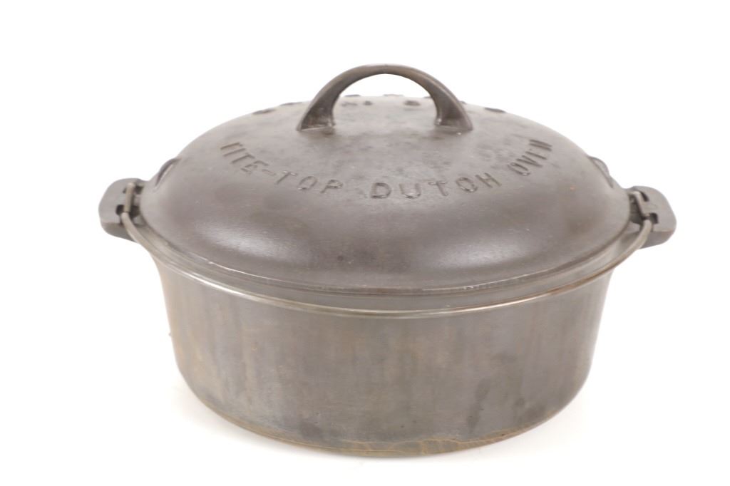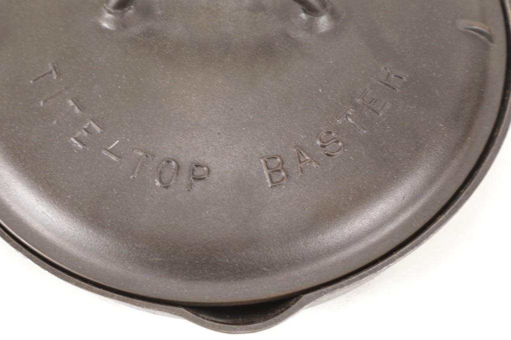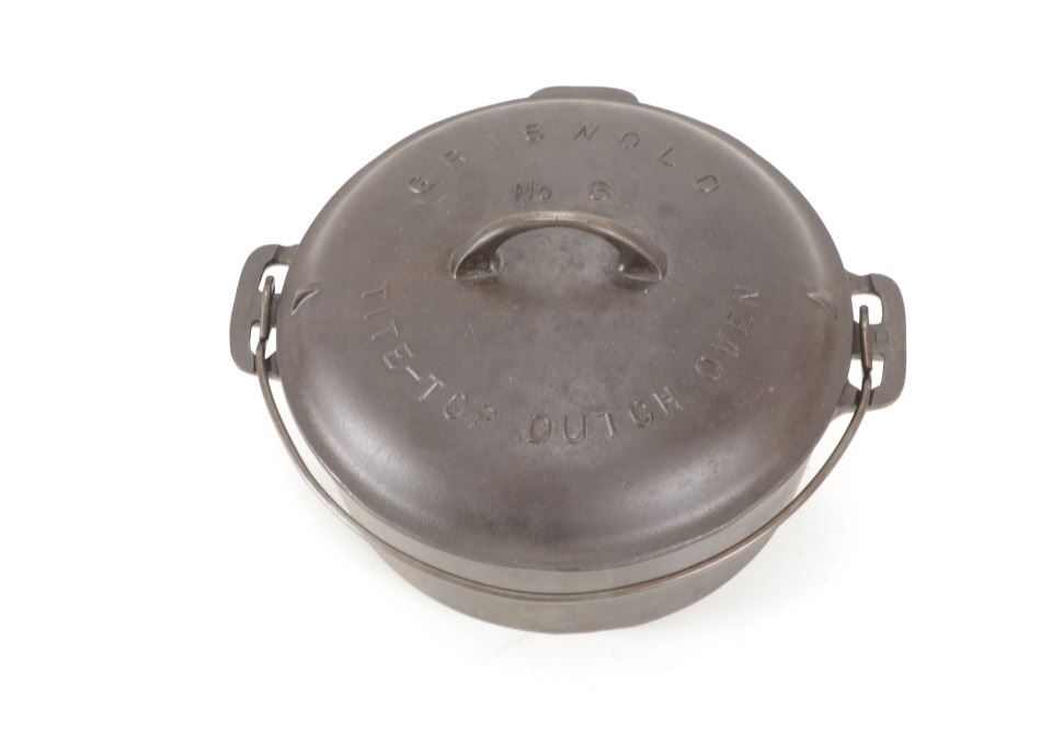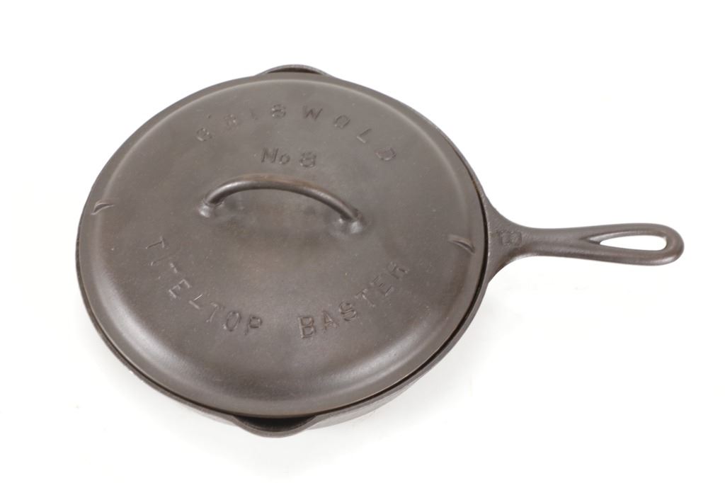 For your consideration is this Griswold cast iron skillet and Dutch oven set from 1920. Griswold Manufacturing, founded in Erie, Pennsylvania in 1865, was a prominent American manufacturer of cast-iron kitchen products, known for its high-quality cookware. The company's journey began with the production of butt hinges and then expanded to include a wide range of cast-iron products like skillets, griddles, and kettles. While initially a small foundry, Griswold evolved into a leading brand, even branching into aluminum and electric cookware later in its history. This set includes three skillets, numbers 6,7 and 8 and a large cast iron pot with a tite-top dutch oven lid and a tite-top baster lid. They are marked on the bottom reading, "Griswold / Eyrie, PA., U.S.A.". They show good condition overall with little to no wear present and no signs of damage is noted. The skillets measure from 13 3/4" L x 9 5/8" W x 1 7/8" H to 15 3/8" L x 11 1/4" W x 2" H, while the dutch oven measures 10 5/8" L x 12 1/4" W x 4" H. The set has a collective weight of 22 pounds and 4 ounces.