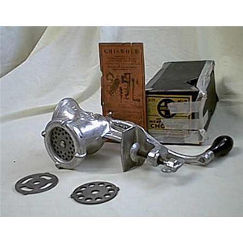 This Griwold #2 combination food and meat chopper is in excellent condition. The box is in poor condition. The directions card is damaged. All the original pieces; body, scroll, ring, clamp screw, wing nut, crank, rotating knife, course plate, medium plate and fine plate are in excellent condition. The crank is marked 1742 The G.M.CO. Erie PA. The body has the Griswold logo and the number 2.