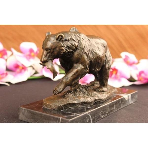 A young bear standing on top of a cliff leaning its weight into a rock, strong and very big animals such as the bear are incredible to watch. It shows the bear having just caught a fish that wriggles hopelessly in its jaws. The wet fur of the bear runs down in his neck as he is content with what for dinner, so he moves in a steady and slow pace making sure his food won't fall. To this day, bears play a prominent role in the arts, mythology, and other cultural aspects of various human societies. The bear was thought to possess diplomacy equal to its great strength and it is the emblem of ferocity in the protection of kindred. A bear is also a symbol of healing and personal health, strength and bravery. Bears paws are also often found as crests or symbols on shields. The handmade bronze sculpture was cast using the ancient method of lost wax casting and stained with a brown patina finish for conservation. It is mounted upon a black marble base. Bronze dimensions with marble base: Height 5 X Width 8 inches. Weight: 7 lbs.