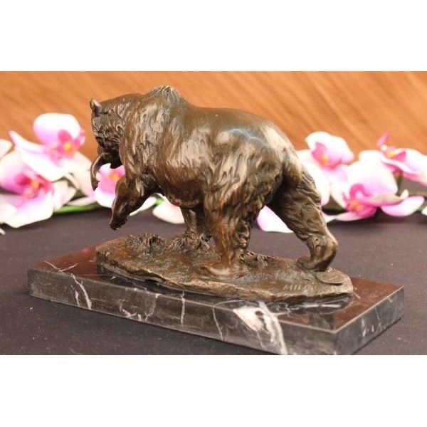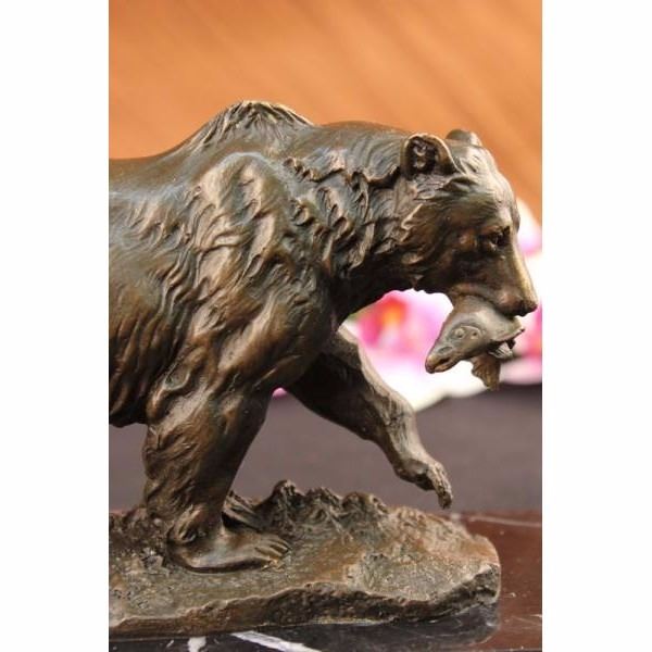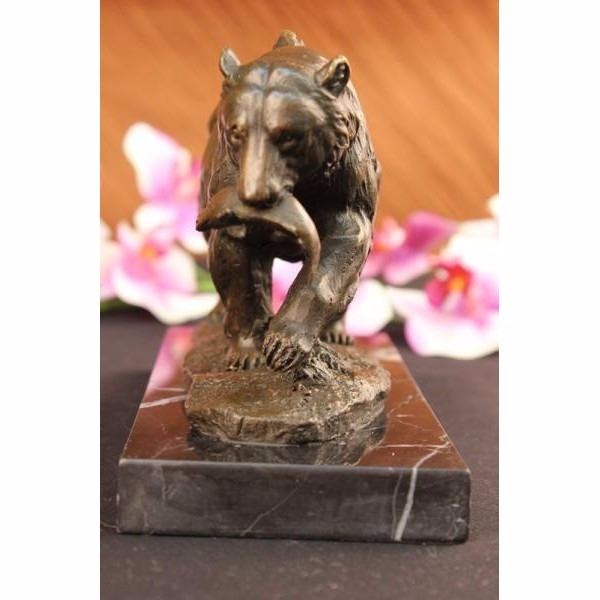 A young bear standing on top of a cliff leaning its weight into a rock, strong and very big animals such as the bear are incredible to watch. It shows the bear having just caught a fish that wriggles hopelessly in its jaws. The wet fur of the bear runs down in his neck as he is content with what for dinner, so he moves in a steady and slow pace making sure his food won't fall. To this day, bears play a prominent role in the arts, mythology, and other cultural aspects of various human societies. The bear was thought to possess diplomacy equal to its great strength and it is the emblem of ferocity in the protection of kindred. A bear is also a symbol of healing and personal health, strength and bravery. Bears paws are also often found as crests or symbols on shields. The handmade bronze sculpture was cast using the ancient method of lost wax casting and stained with a brown patina finish for conservation. It is mounted upon a black marble base. Bronze dimensions with marble base: Height 5 X Width 8 inches. Weight: 7 lbs.