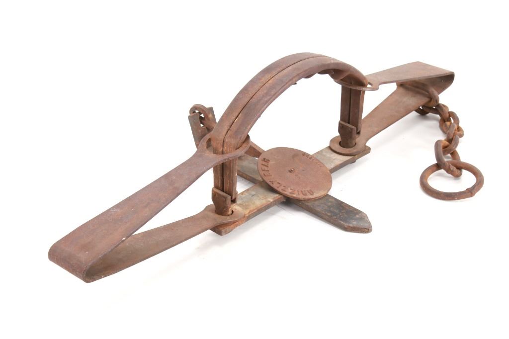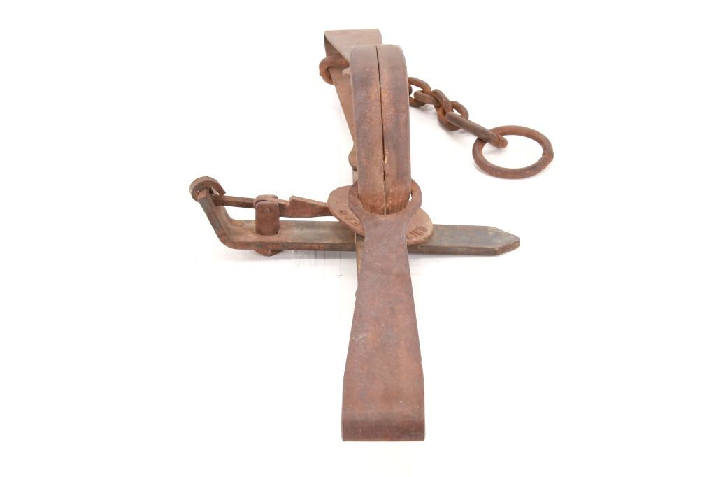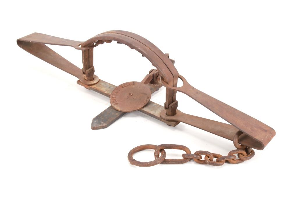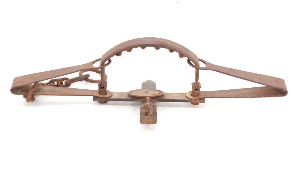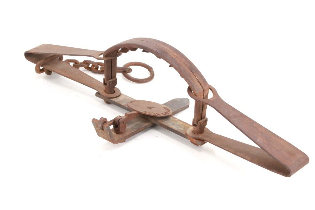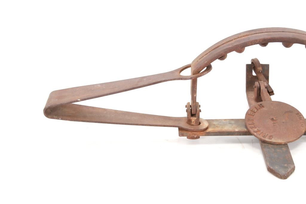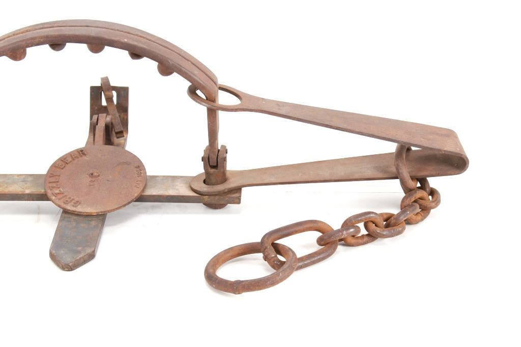 Featured in this lot is a Grizzly Bear No. 6 double spring bear trap. The bear trap features a wonderfully and professionally crafted steel construction that shows the pan reading as follows: Grizzly Bear - No. 6 - Pat 1858. The condition of this bear trap is well preserved with oxidation shown to the trap but otherwise shows well preserved overall condition. The measurements of this bear trap are 43" x 16" x 11 1/4". The approximate collective weight of this trap is 50lbs.*