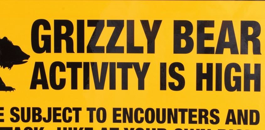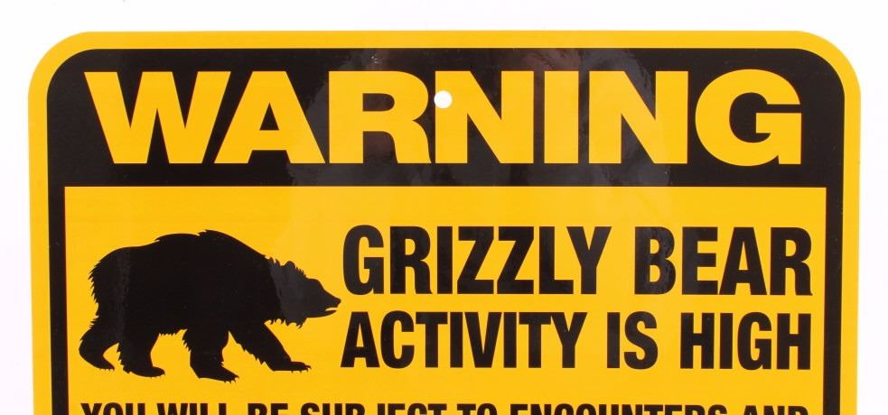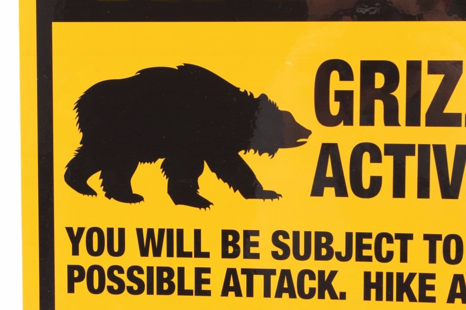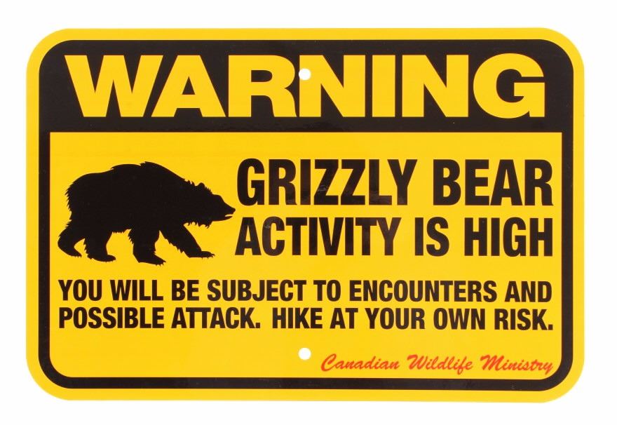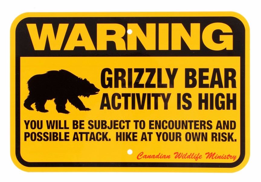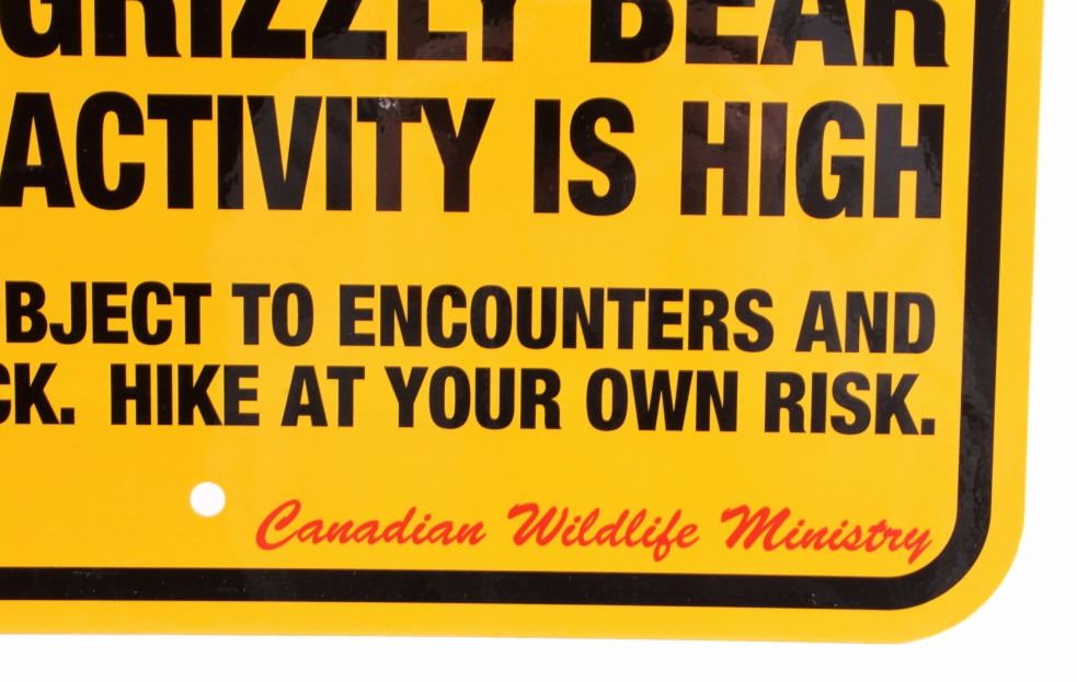 This is a Grizzly Bear Warning sign from Canada. The sign is from the Canadian Wildlife Ministry and reads "Warning Grizzly Bear Activity is High. The sign is a high visibility yellow and features a silhouette image of a grizzly bear. The sign is in very good condition. It measures 12" x 18".