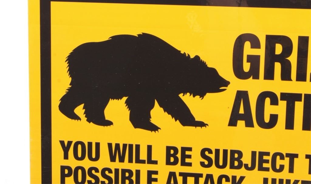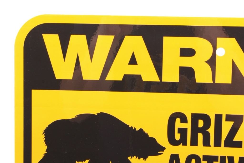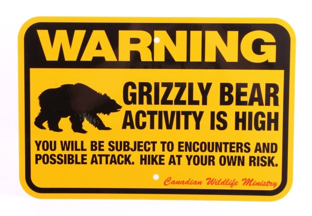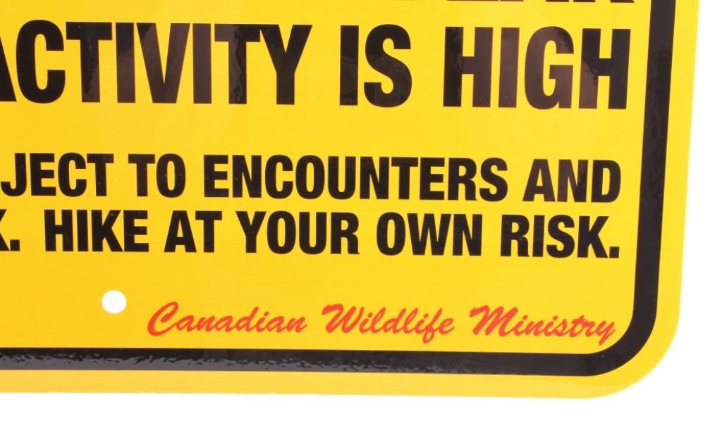 This is a Grizzly Bear Warning sign from Canada. The sign is from the Canadian Wildlife Ministry and reads "Warning Grizzly Bear Activity is High". The sign is a high visibility yellow and features a silhouette image of a grizzly bear. The sign is in very good condition. It measures 12" x 18".