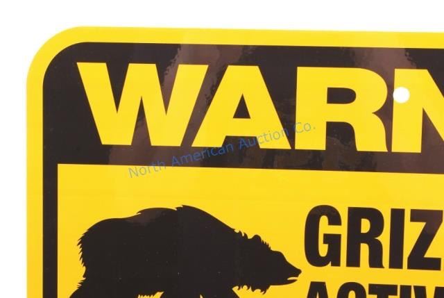 This is a Grizzly Bear Warning sign from Canada. The sign is from the Canadian Wildlife Ministry and reads "Warning Grizzly Bear Activity is High. The sign is a high visibility yellow and features a silhouette image of a grizzly bear. The sign is in very good condition. It measures 12" x 18".
