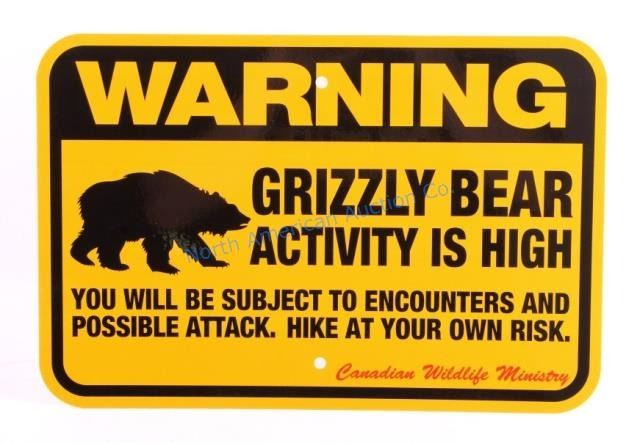 This is a Grizzly Bear Warning sign from Canada. The sign is from the Canadian Wildlife Ministry and reads "Warning Grizzly Bear Activity is High. The sign is a high visibility yellow and features a silhouette image of a grizzly bear. The sign is in very good condition. It measures 12" x 18".