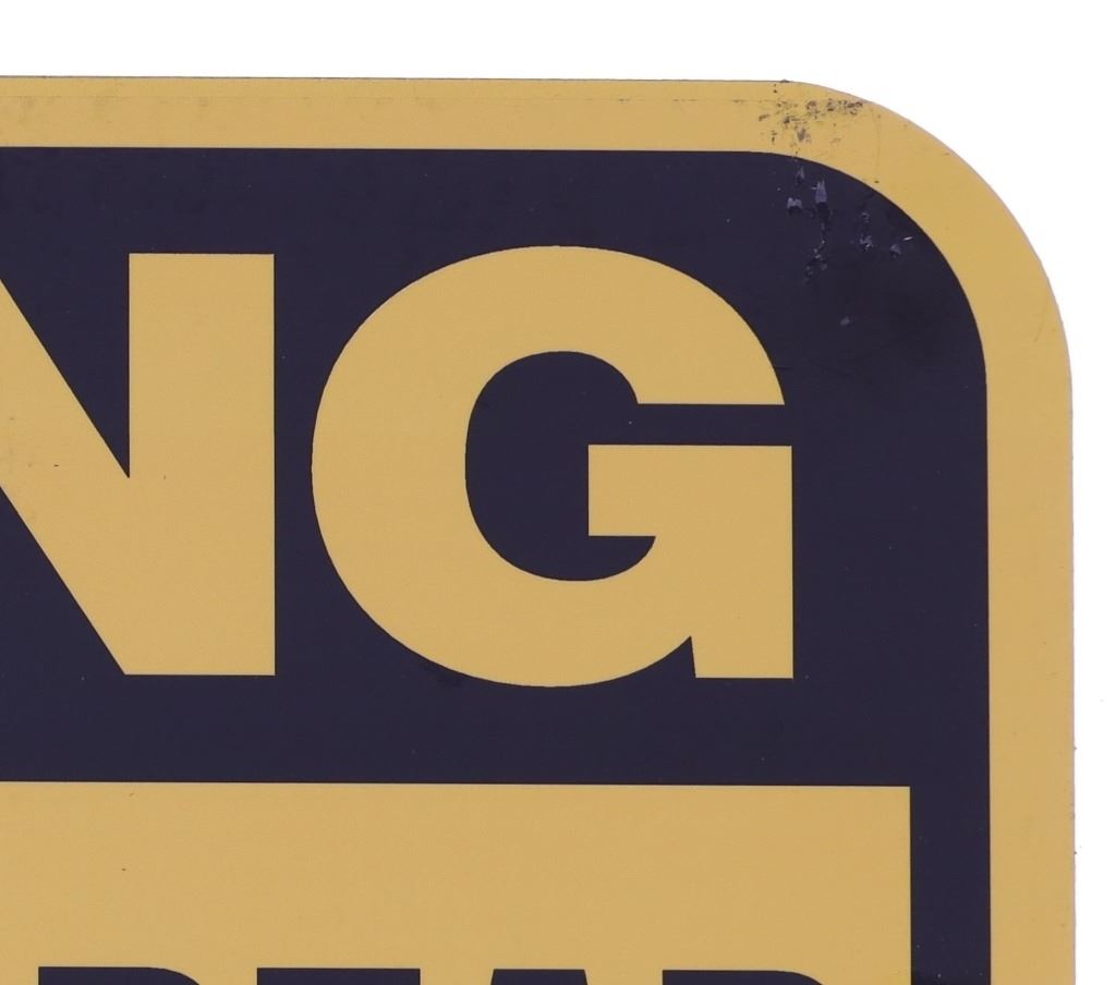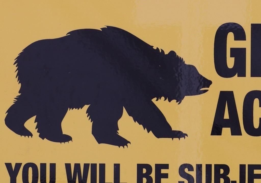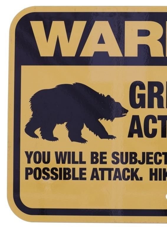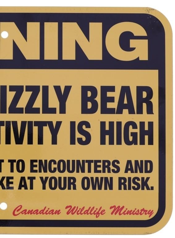 This is a Grizzly Bear Warning sign from Canada. The sign is from the Canadian Wildlife Ministry and reads, "Warning Grizzly Bear Activity is High.” The sign is a high visibility yellow and features a silhouette image of a grizzly bear. The sign is in very good condition. It measures 18" x 12".