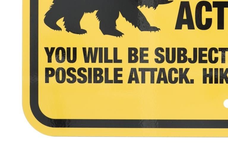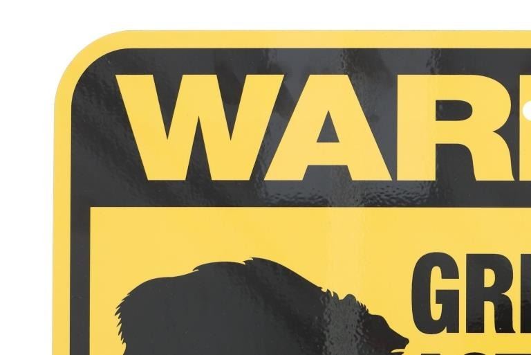 This is a Grizzly Bear Warning sign from Canada. The sign is from the Canadian Wildlife Ministry and reads, "Warning Grizzly Bear Activity is High.” The sign is a high visibility yellow and features a silhouette image of a grizzly bear. The sign is in very good condition. It measures 18" x 12".*