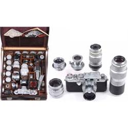 Großer Universalkoffer, Rindsleder, 27 x 31 cm, gefüllt mit "Leica IIIa", Nr. 627.690, rote Kontaktzahlen, "Summitar 2/5 cm", "Summarit 1,5/5 cm", "Elmar 3,5/5 cm", "Summaron 3,5/3,5 cm", "Elmar 4/9 cm", "Hektor 4,5/13,5 cm", Sucher "VIOOH", "SBOOI", "ROSOL", "Metraphot"-Belichtungs-messer, Blitzgerät "CEYOO", 9 Filter, Selbstauslöser "APDOO", Naheinstelleinrichtung "NOOKY-HESUM", 5 Leica-Kassetten in Döschen und andere Kleinteile. Dabei Anleitung für "Leica IIIc" und Original-Füllplan für Koffer. Ein Sucherfach ist leer. - Eine Traumausrüstung im Spitzenzustand! Great Leica case, leather, with "Leica IIIf", 6 lenses, 3 finders, 1 flash gun, light meter and a lot of other accessories. - Top-condition! Extraordinary collector's item and exposition piece! - € 2.500/3.000 - (54/6)