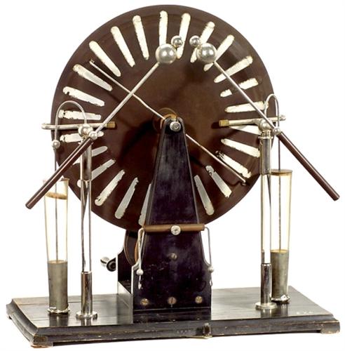 Große Wimhurst'sche Influenzmaschine Unbezeichnet, 2 gegenläufige Glasscheiben (Ø 45 cm), 2 Leydener Flaschen, 2 Konduktoren mit Handgriffen aus Bakelit, Holzsockel, Handkurbelantrieb, Gesamtmaße: 60 x 32 x 60 cm. – Voll funktionsfähiger Originalzustand. – Literatur: Fons Vanden Berghen "Classic of Communication", Brüssel 1999, S. 15. Large Wimshurst's Electrostatic Machine Unmarked, a pair of contrarotating discs with strips of tin foil at the runs (Ø 17 3/4 in.), 2 Leyden jars, handcrank-operated, dimension 23 2/3 x 12 3/5 x 23 2/3 in. – A fully working museum piece in original condition! – (3/2-) – € 700/1.200 – (257/1)