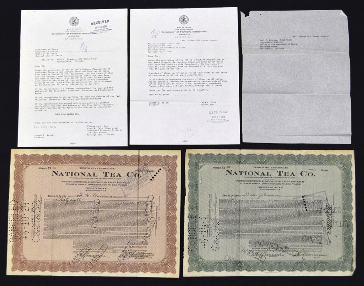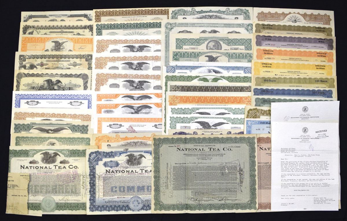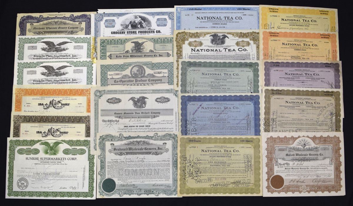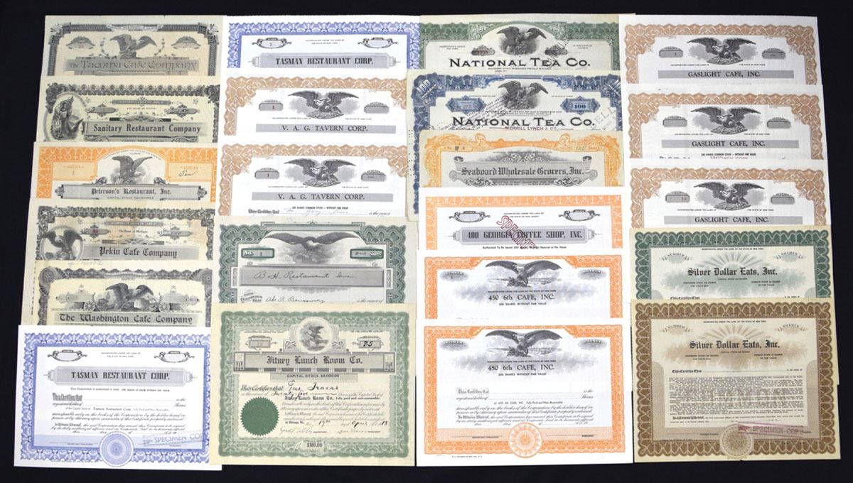 Various States.., ca. 1910-60s. Lot of Lot of 40+ I/U and I/C Stock Certificates from chains, cafes, taverns, supermarkets, and food wholesalers. Highlights include: National Tea Co. (multiple examples); Tasman Restaurant Corp.; Silver Dollar Eats, Inc.; Gaslight Cafe, Inc.; Seaboard Wholesale Grocers, Inc.; and Franklin Plaza Supermarket, Inc. Certificates feature colorful borders in orange, green, blue, purple, and brown, with eagle and allegorical vignettes, embossed seals, and occasional state-related correspondence. Condition ranges VF to XF with folds, punch and ink cancellations, and minor edge wear typical for the period. (40+). Sold "AS IS" no returns accepted.