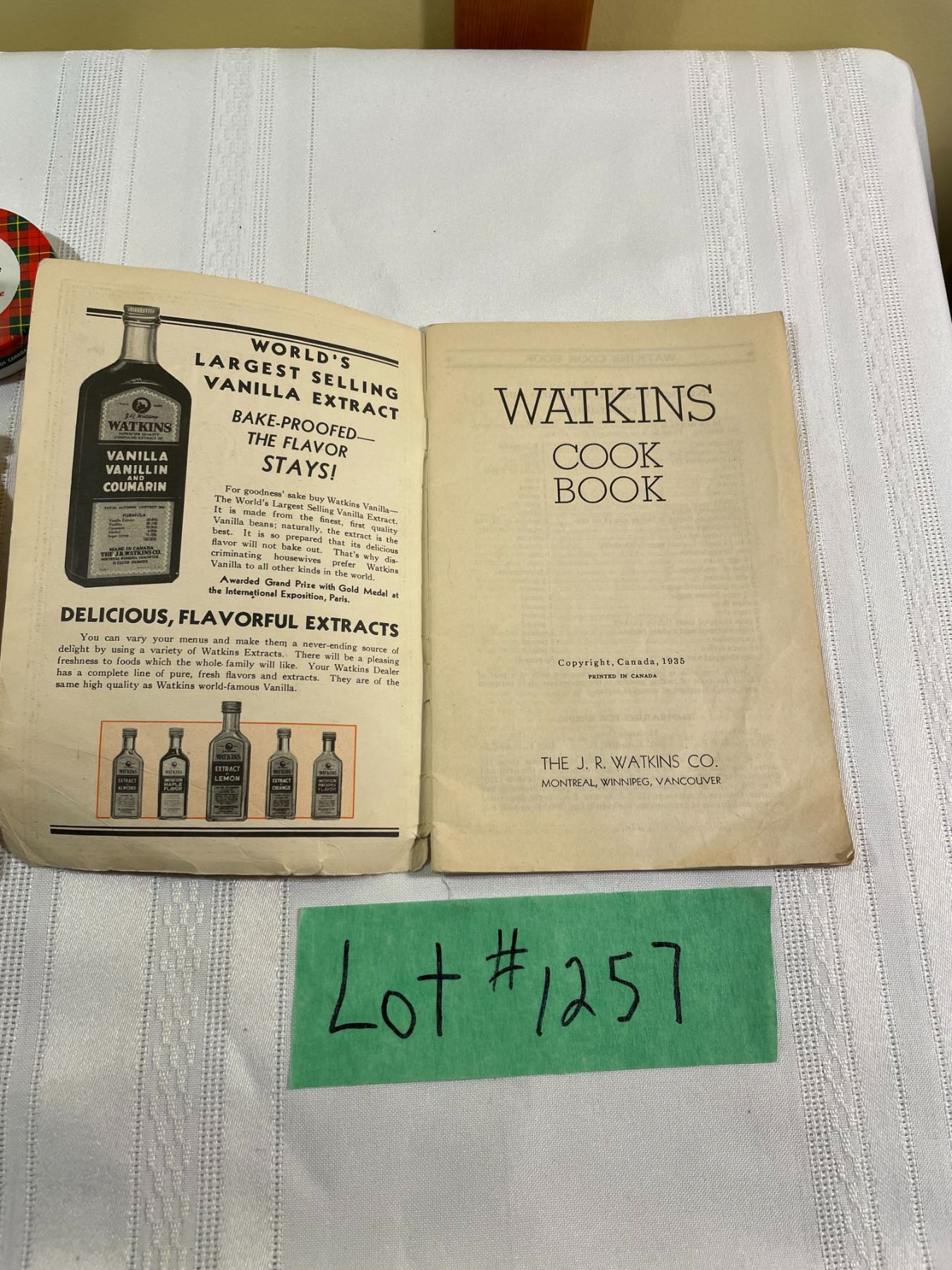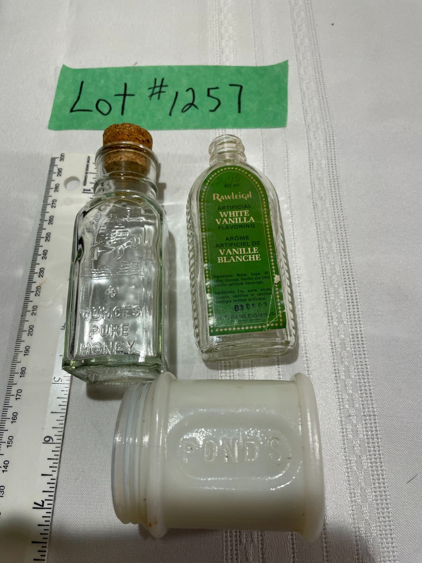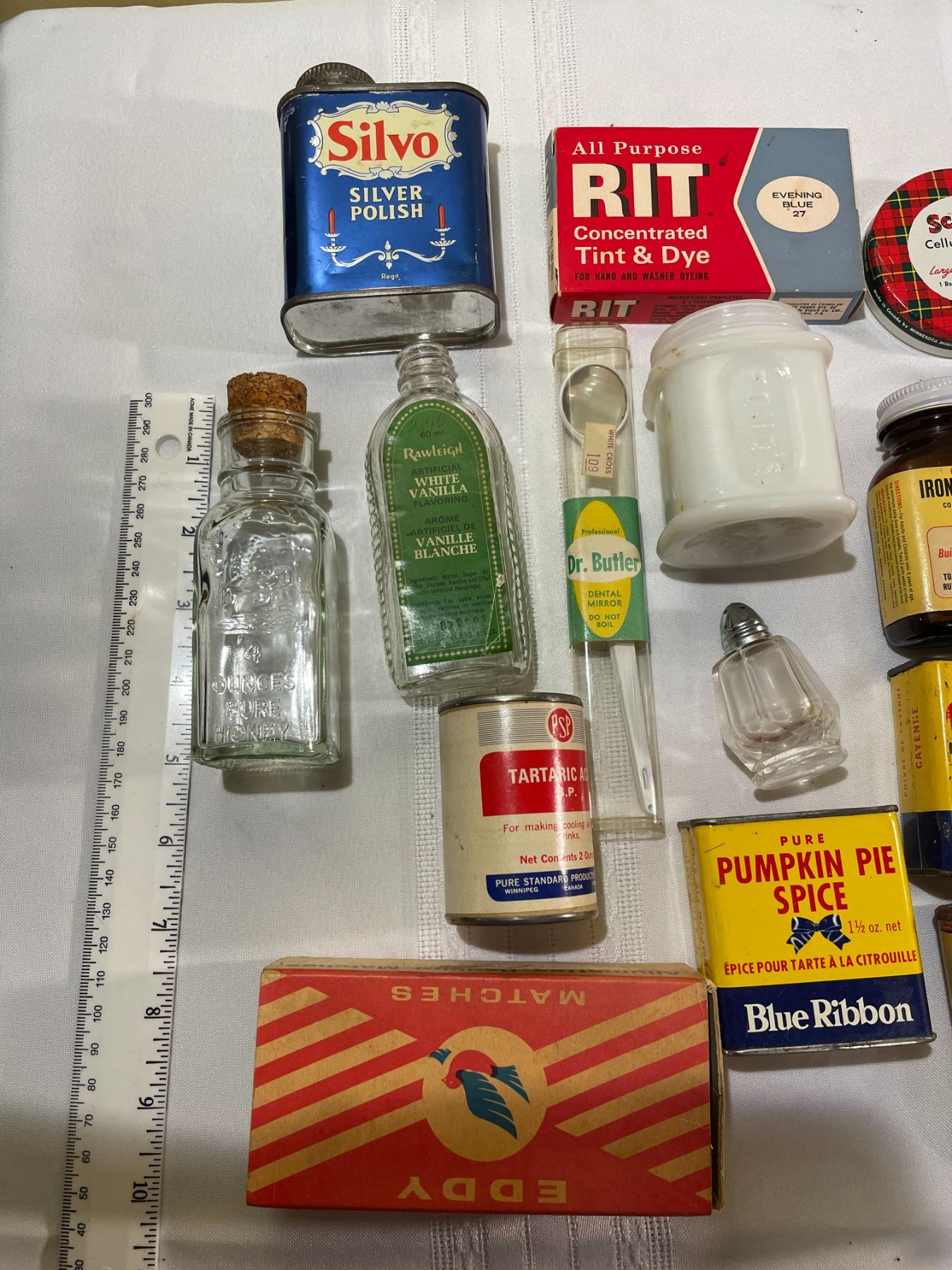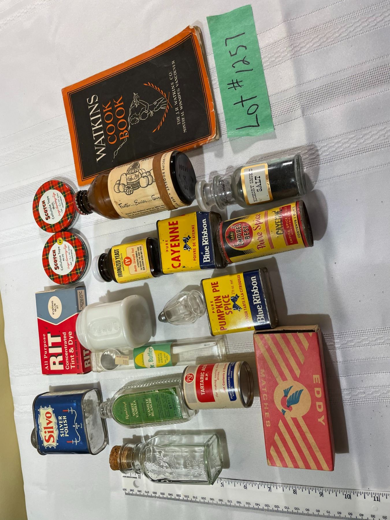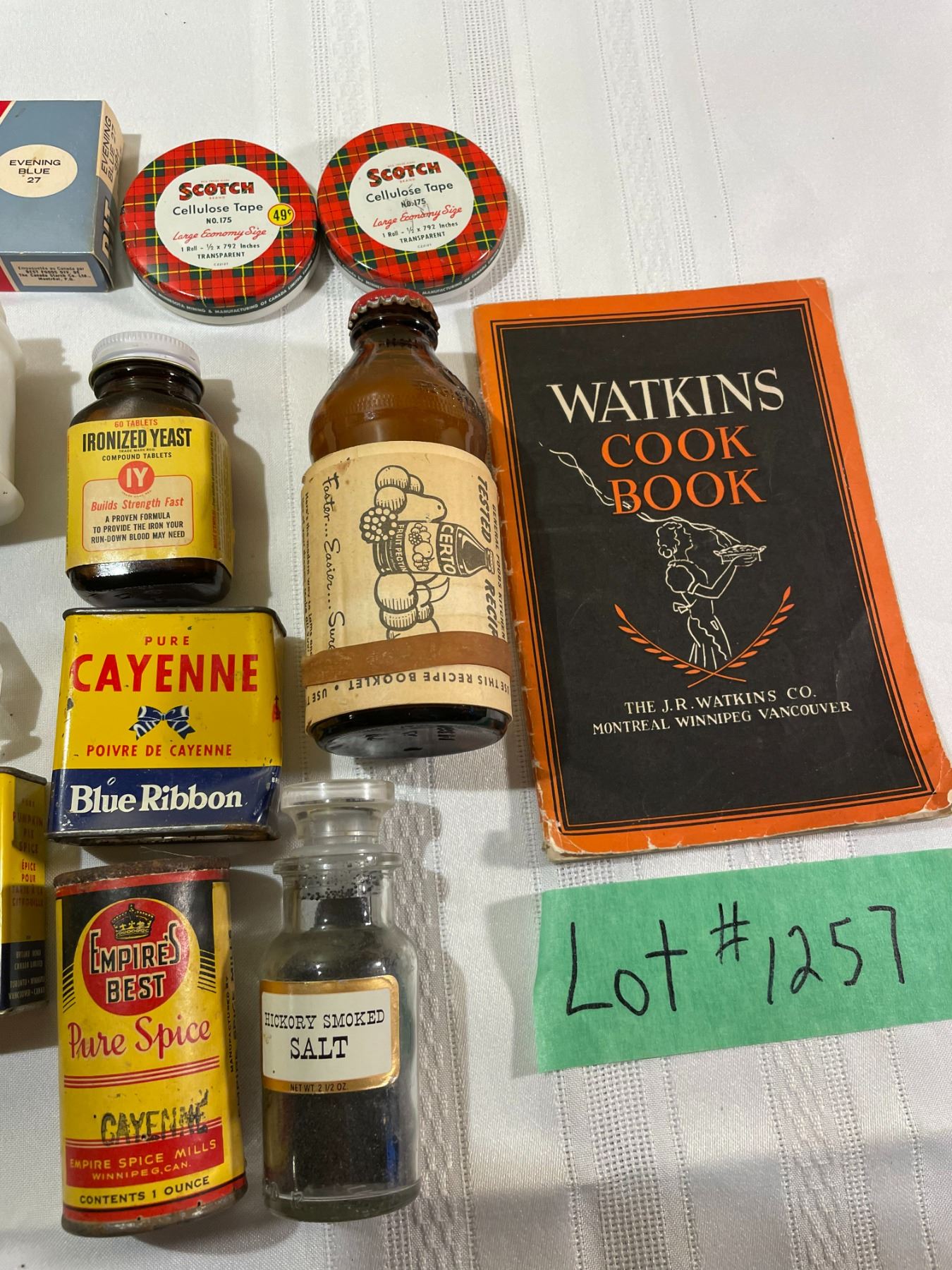 (1) Watkins Cook Book - 1935 Copy right Booklet Size (1) Metal Can Silvi Silver Polish (1) Box Rit tint and Dye Evening Blue #27 (1) Box Eddy Matches - Box only (1) Metal Box Pure Pumpkin Spice Blue Ribbon (1) Scotch Cellulose Tape metal container # 175 49cents Price (1) 1 of above with no pricetag (1) Dr. Batler Dental Mirror (white Cross 109 Price Tag) (1) Can from Tartaric Acid 2 oz.(1) Empire Best Pure Spice Cayenne - 1oz. (1) Ponds Glass Container - no lid -white (1) Raw Leigh Artificial White Vanilla Flavoring Clear glass bottle - no lid (1) Glass Bottle Clear with Cork Lid 4 oz. Pure Honey (1) Brown Bottle For Ironized Yeast Tablets with lid (1) Salt or Pepper Glass shaker (tiny) (1) Glass container - Hickory Smoked Salt 2oz. (1) Glass Certo (Brown) container with dried certo + metal lid and 1 recipe booklet
