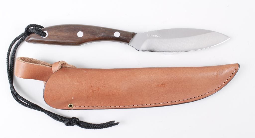 Blade is approx 4"x1", 8.50" open overall length, rosewood handle, high carbon stainless steel blade, regular open mouth leather sheath. Retail $275.00